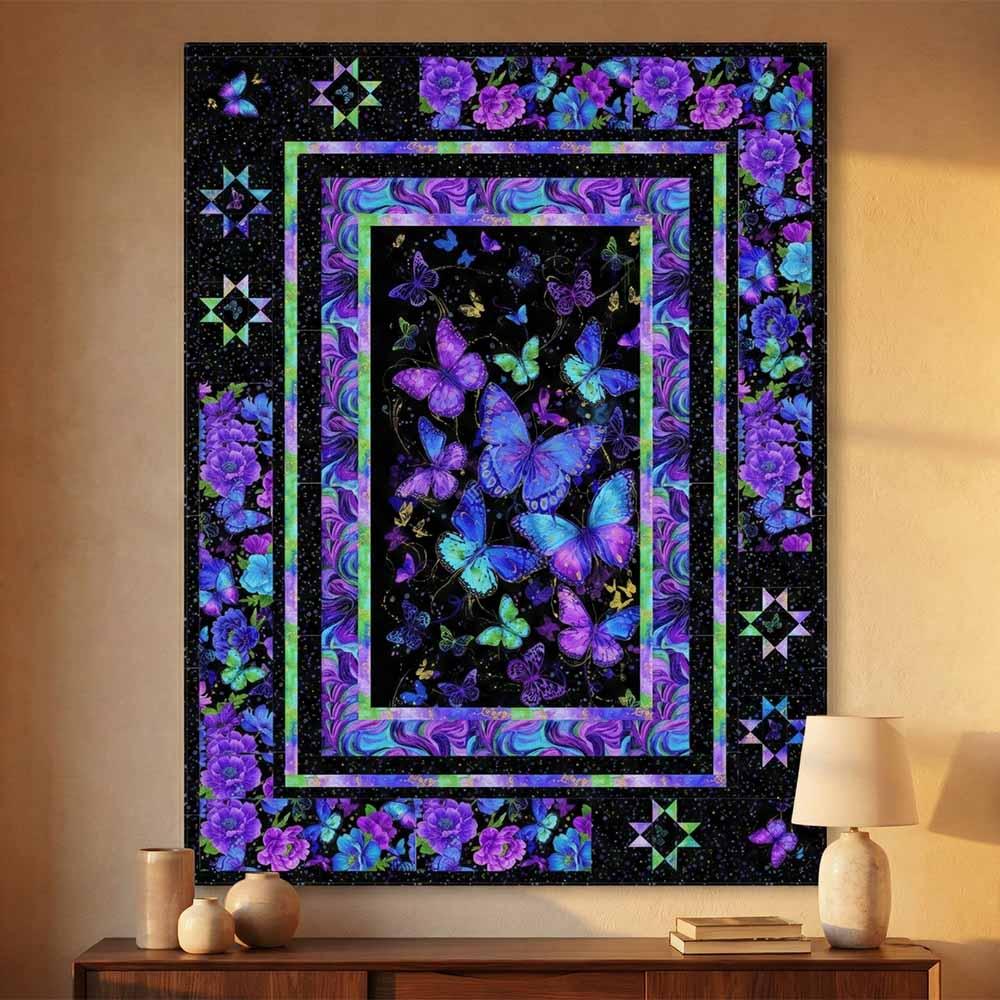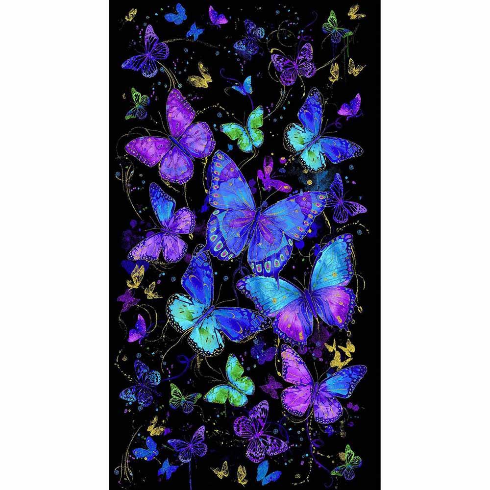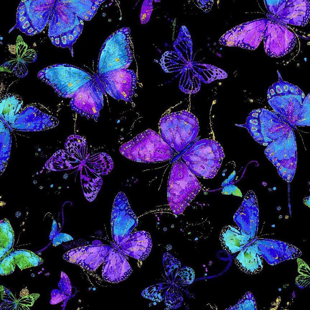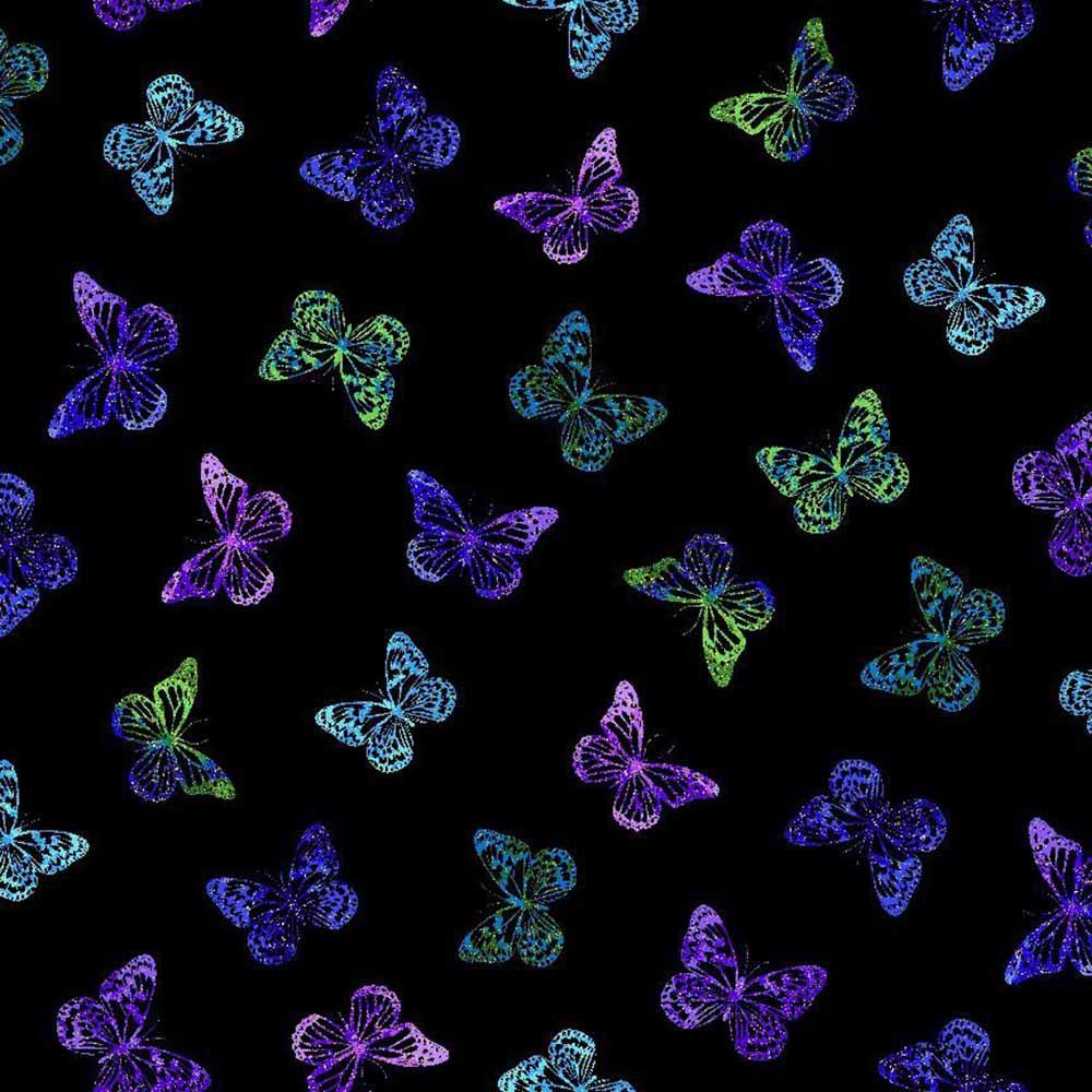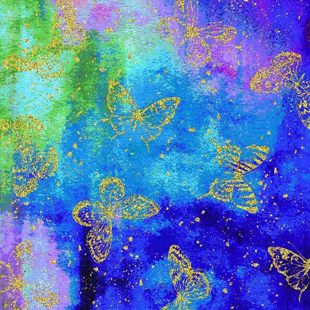 Evening Glow – Metallic by Chong-A Hwang for Timeless Treasures captures the quiet enchantment of twilight, where rich jewel tones, shadowy neutrals, and softly glowing metallic accents come together beneath fluttering butterflies. Delicate butterfly motifs drift across textured backgrounds and flowing color blends, evoking transformation, calm, and the gentle beauty of evening light as it fades into night.