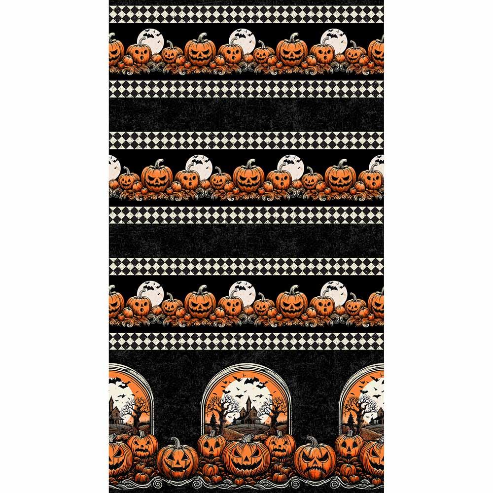 The Haunted Hallow Quilt Kit includes pattern by Jean Nolte for Patrick Lose Studios, and all fabric needed to complete the top and binding of a 58-1/2" x 70-1/2" quilt. Backing is available separately, 4 yards x 44' recommended.