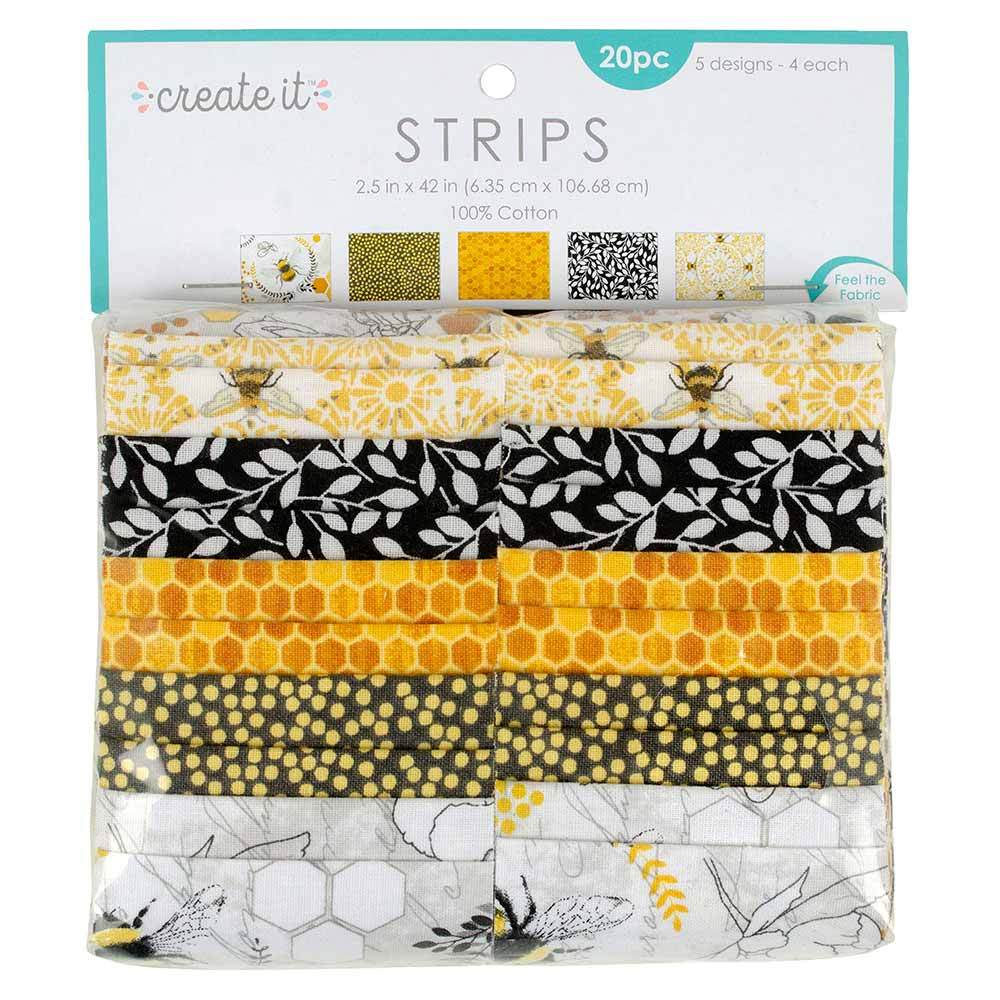 The Bee 2.5" x 42" Strips pack includes 5 different prints that are perfectly coordinated. Pack includes 20 pieces total.