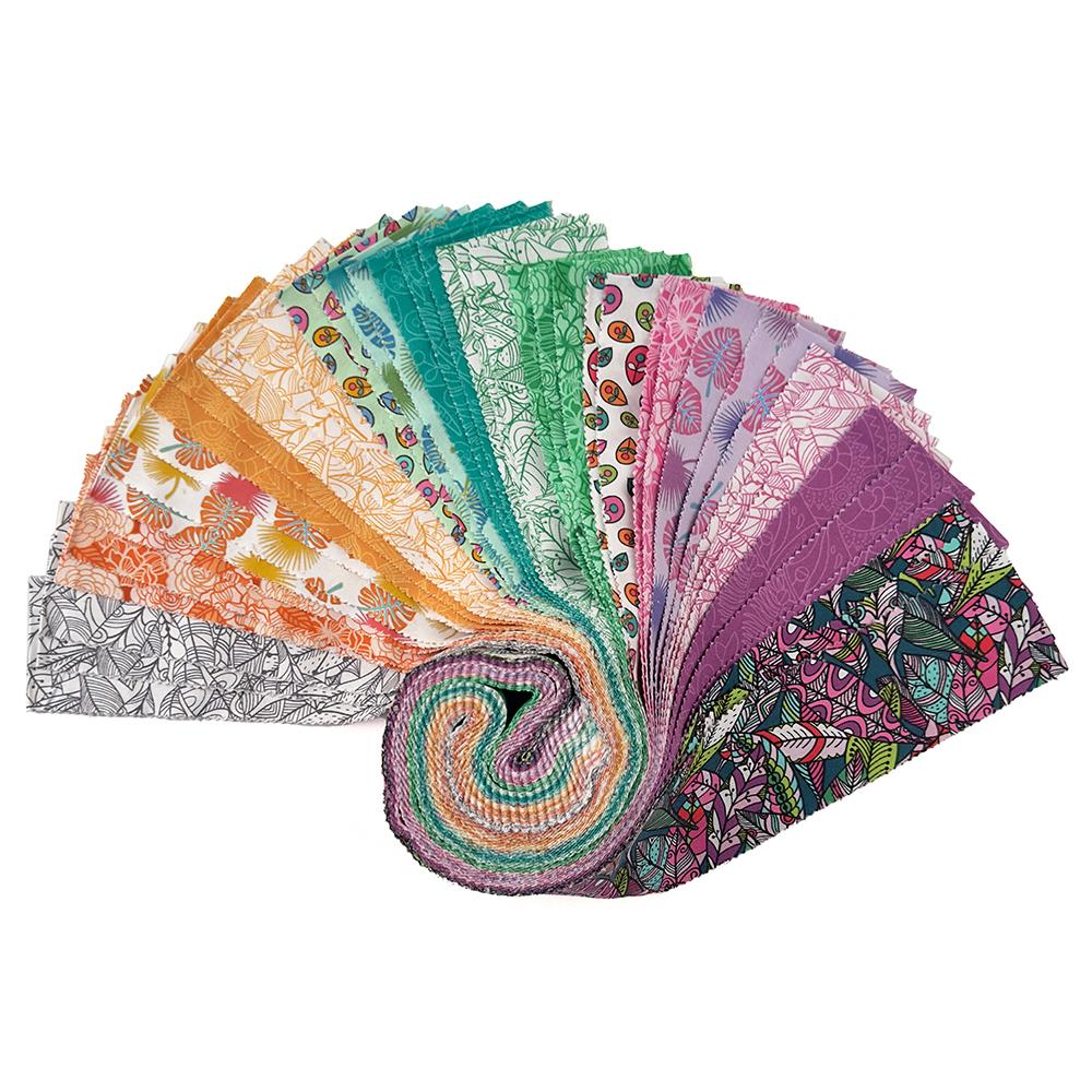 A year spent living in the remote Australian outback -- complete with daily kangaroo visitors -- was the inspiration for this bright, whimsical fabric collection. Providing food and water for the “roos” allowed for close-up observation of their sweet and quirky mannerisms. While never trying to tame them, Kimberly and her kitties were able to be within inches of these beautiful animals to enjoy their curiosity, playtime, and the adorable ways they chew their food. Native foliage, feathers and other amazing creatures, including koalas and brilliantly colored birds, also star in these cheerful fabric prints which are sure to be part of many beautiful projects. The Rooville 2.5" Strips collection includes 42 pieces.
