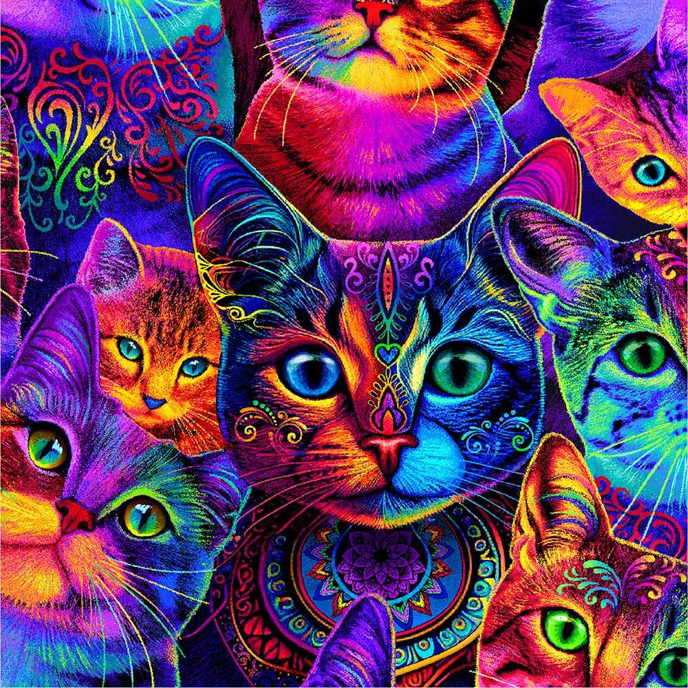 This vibrant fabric features a mesmerizing array of colorful cats, each depicted in vivid, neon hues that blend seamlessly into a kaleidoscopic pattern. The design showcases a variety of cat faces, each with distinct expressions and glowing eyes, set against a backdrop that transitions through shades of purple, blue, green, and pink, creating a dynamic and eye-catching visual experience. The 58" wide Kitties print in Multi is by Timeless Treasures from their Sophisti-cat collection.