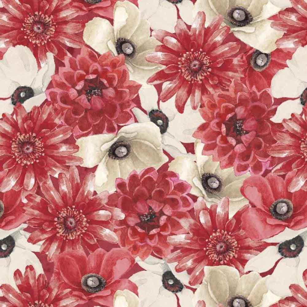 The Packed Floral in Multi 108" wide print features cream and red florals and is from the Scarlet Dreams collection by Beth Grove for Wilmington Prints