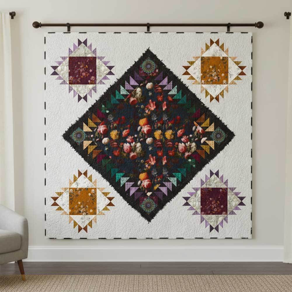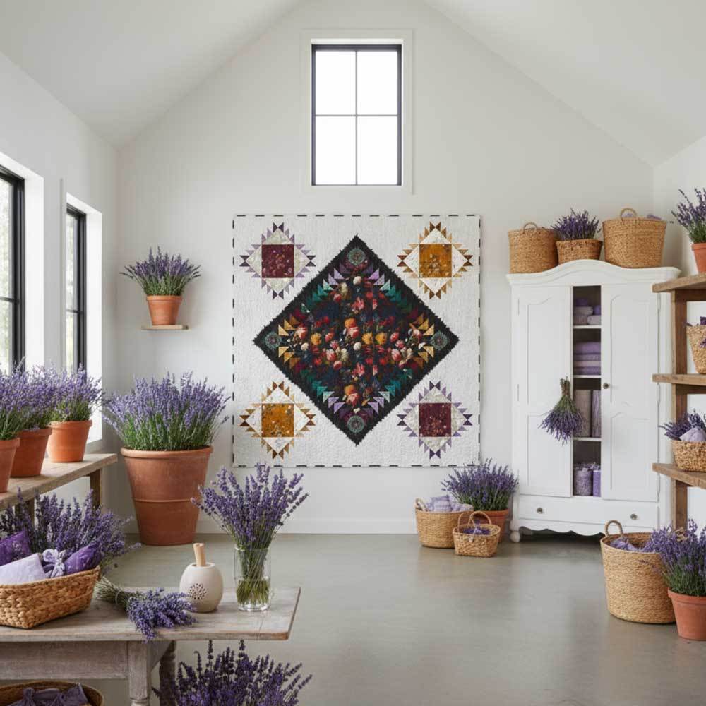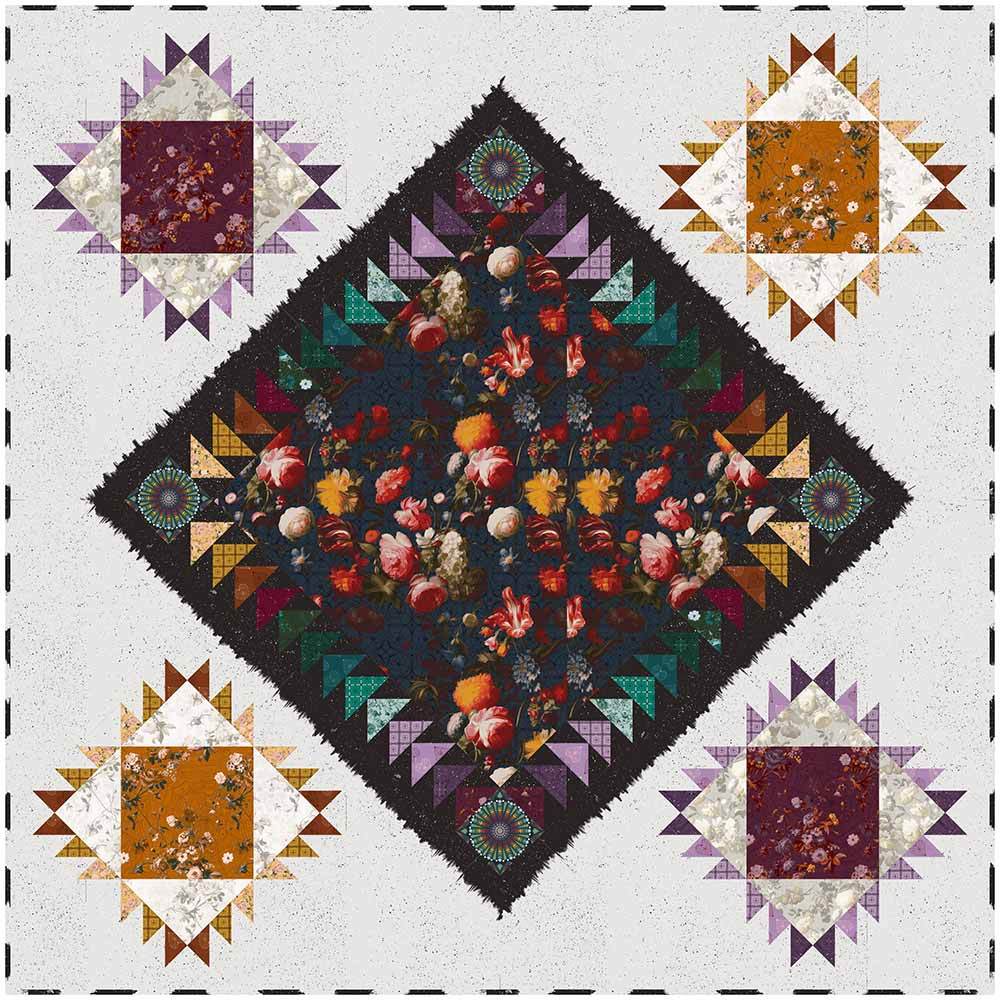 The Enrapture Kit includes pattern by FreeSpirit and all the fabrics needed for the top and binding of a 94" x 94" quilt from the Enrapture collection by Giucy Giuce. Backing available separately, 3 yards x 108" wide recommended.