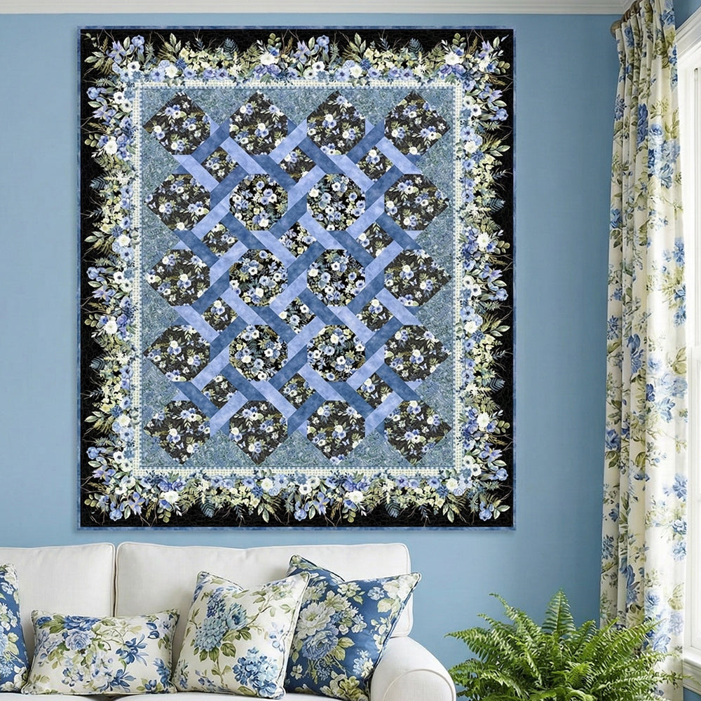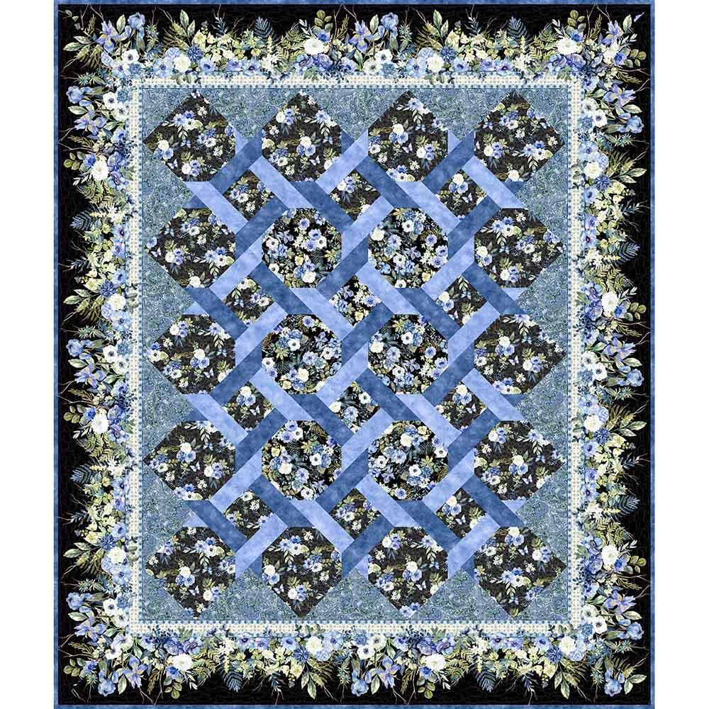 The Sanctuary Quilt Kit includes pattern and all fabrics needed to complete the front and binding of a 70" x 87" quilt. Backing is available separately, 6 yards x 44" wide is recommended.