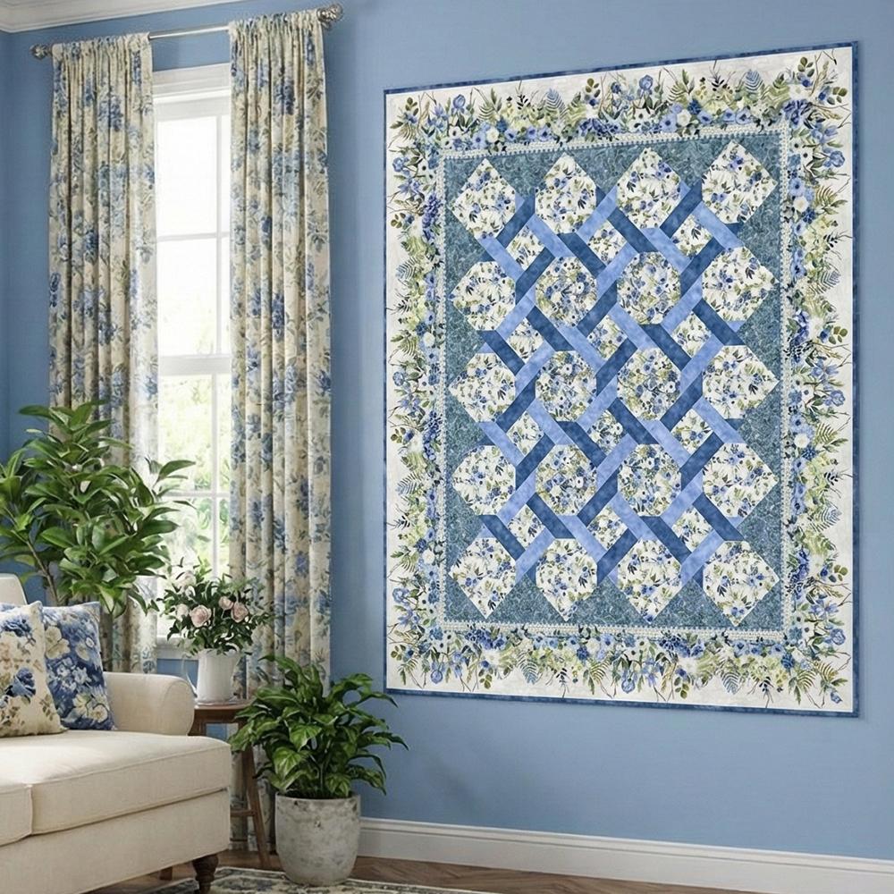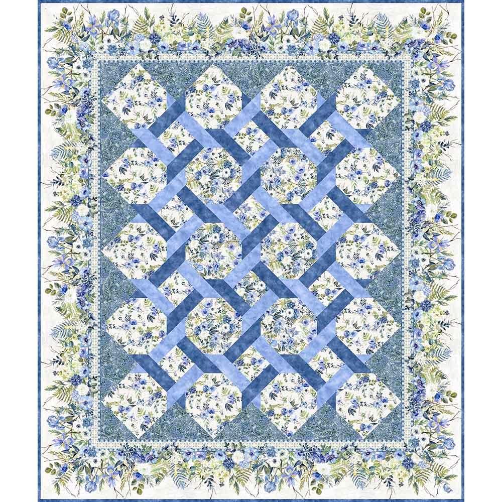 The Sanctuary Garden Twist Quilt Kit includes pattern and all fabrics needed to complete the front and binding of a 64"x 75" quilt. Backing is available separately, 5 yards x 44" wide is recommended.