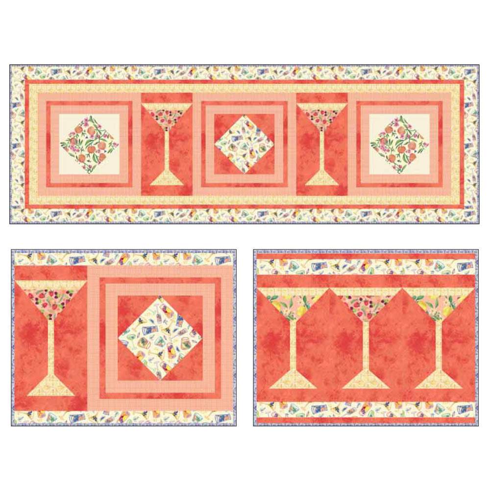 This fun pattern includes instructions for matching placemats and tablerunner featuring martini glasses. Paper templates included.