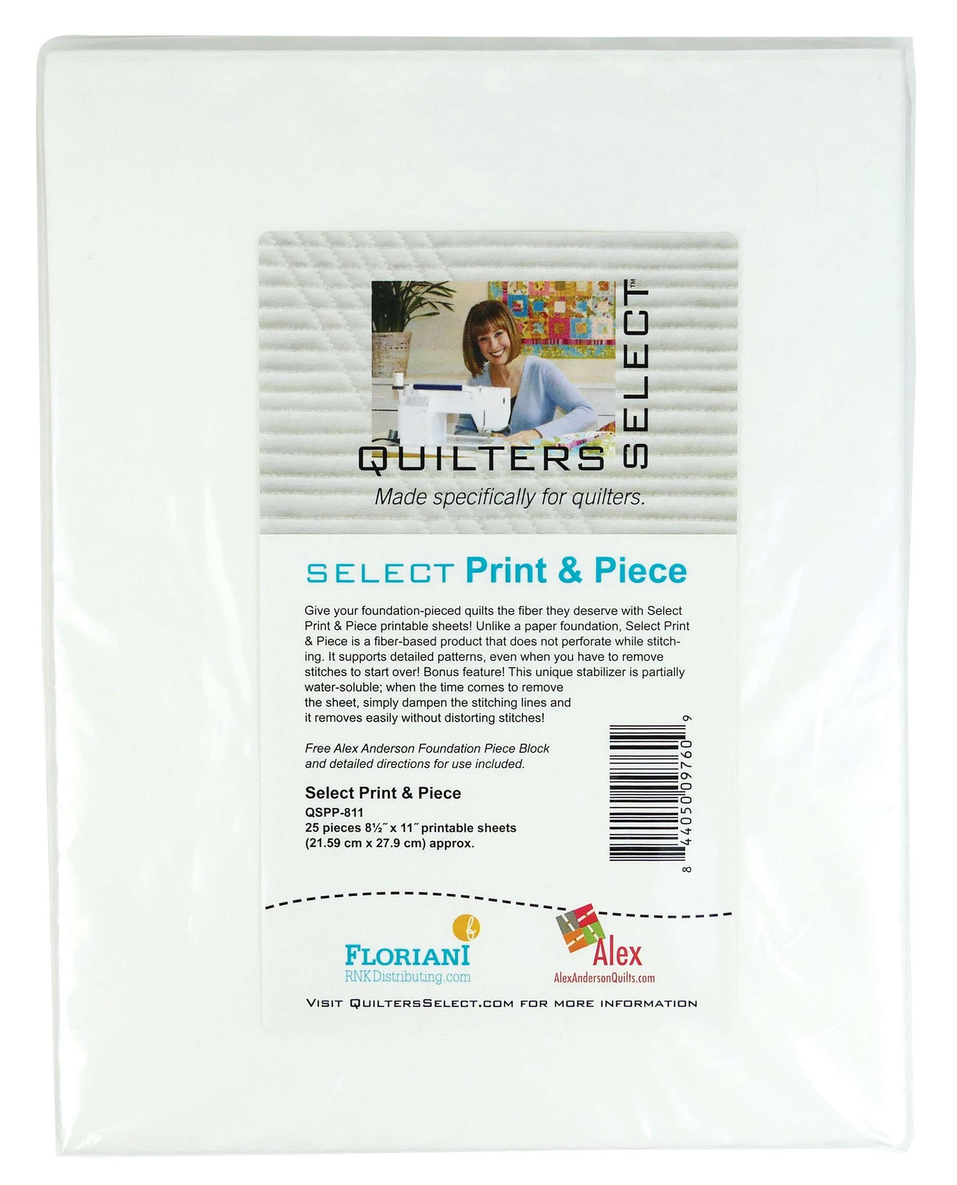 Ideal for turned edge applique and English paper piecing! This fiber-based foundation gives solid yet soft support for detailed or heavy stitching and the temporary fuse keeps fabrics from shifting or pulling. The fibers of Select Print & Piece Fuse Lite are partially water-soluble; simply dampen the stitching lines and the foundation is removed easily without distorting stitches. For paper or foundation piecing: If possible, set your printer’s paper feed settings to “Decorative or Heavy Paper.” If your printer does not have this setting, load only one sheet of Print & Piece at a time. Copy or print your favorite foundation or paper-piecing pattern directly onto Print & Piece stabilizer. Cover the numbered sections as directed with your favorite fabrics until the block is complete. Remove the stabilizer: once the stitching is complete, lightly dampen only the stitching lines with a wet sponge or cotton swab – the stabilizer tears away gently without distorting the stitches! You can alternately leave the stabilizer within the block completely. When the quilt is laundered, the water-soluble fibers will dissolve and the non-soluble fibers will leave behind a very subtle loft. Create a test block with this method before applying it to an entire quilt to make sure you are happy with the results! For stabilizing decorative or satin stitches: Place one layer of Print & Piece directly under fabric and stitch. To remove the stabilizer, lightly dampen only the stitching with a sponge or cotton swab – the stabilizer will pull away without distorting delicate heirloom, satin or decorative stitches! * Non-Woven * Not Fusible * Weight: Midweight * Single Sided * Washing/Drying Instructions: Cool water and low drying temperature recommended. Press using a medium setting on your iron.