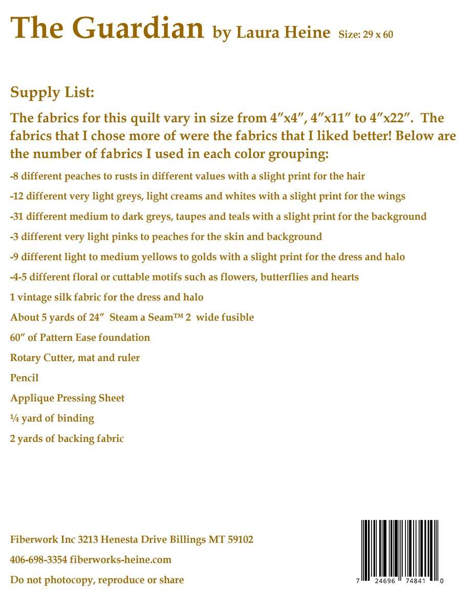 The Guardian, angel collage pattern features full sized pattern and complete step by step color photos and instruction on how to construct this painterly collage. Size 29 inches x 60 inches. Pattern also includes a bonus mini angel pattern. Fabric not included.