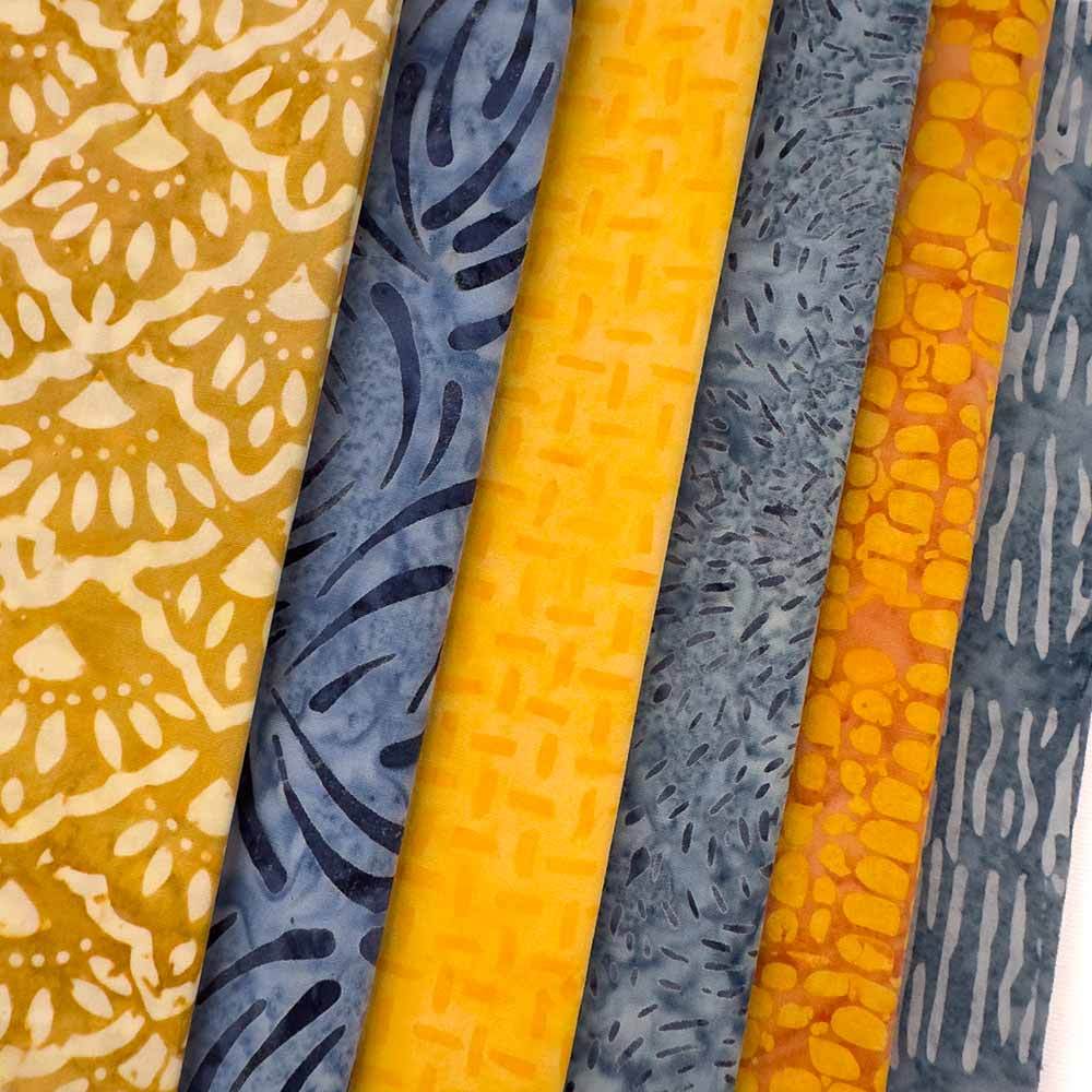Mountain High from Riley Blake’s Expressions Batiks line is a stunning mountain‑inspired collection of hand‑dyed Tjap batiks. With golden straw tones and deep blues each print brings organic texture and depth. Perfect for quilts that convey mountain vistas or warm-cool contrasts in geometric patterns. The Tjaps Batiks Medley includes 6 fat quarters.