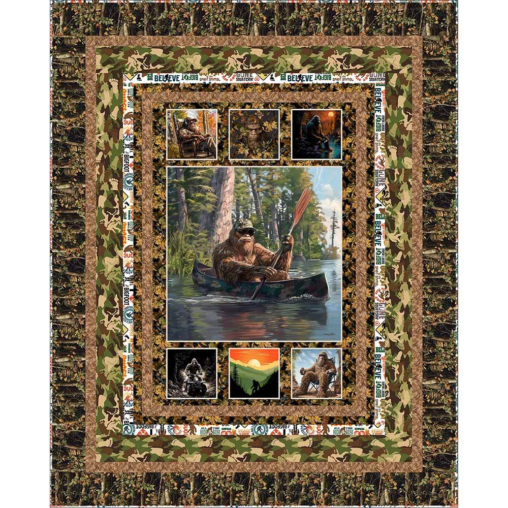 A quiet canoe ride is one of Bigfoot's favorite things. The Legendary Loner Kit includes pattern from 3 Wishes and all the fabrics needed, including panel, for the top and binding from the Legendary Loner collection by Jim Baldwin. Finished size is 49" x 61". Backing is available separately, 3 yards x 44" wide recommended.