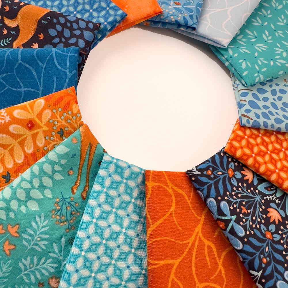 Flora & Fauna celebrates the beauty of nature. In an enchanted forest, the gentle scent of pine mingles with the sweet fragrance of wildflowers, while a gentle breeze rustles the leaves, and birds chirp in the trees. Deer graze peacefully in the glade and rabbits hop playfully among the greenery, adding to the harmonious beauty of this untouched wilderness. As sunlight wanes, colors cool, and a twilight glow blankets the woodland. This is the inspiration for the “Midnight” color story, featuring rich blue tones accented with apricot and chestnut hues. The Flora & Fauna - Midnight 10" Squares collection includes 42 pieces.
