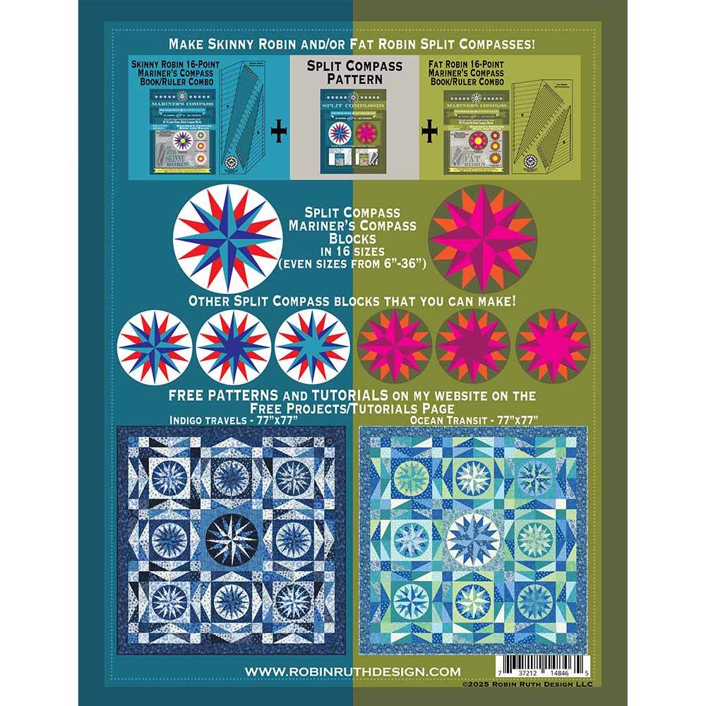 20-page booklet including instructions for making Skinny Robin or Fat Robin Split Compass blocks to be used with either the Skinny Robin 16-Point Book/Ruler Combo or the Fat Robin 16-Point Book/Ruler Combo. Tables for making these blocks in 16 sizes (even sizes from 6”-36”) for either Round Traditional finishing or OctaCompass No Circle finishing. Free video tutorials for making these blocks, and free quilt patterns also with free video tutorials are available on this website on the Free Projects/Tutorials page.