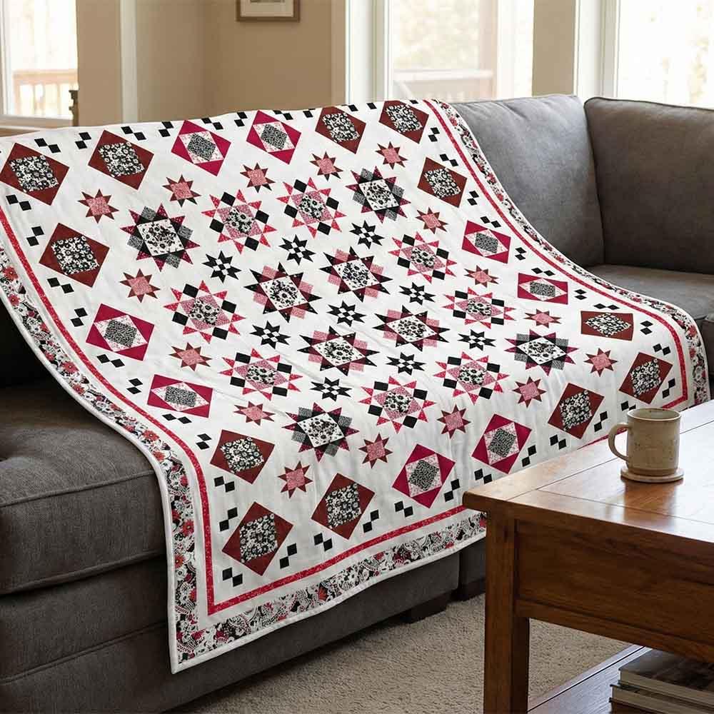 A Keepsake Quilting Exclusive Project! This dramatic and timeless collection from P&B is striking, modern, and graphic. Archival prints, including a bold paisley, have been given an updated color palette that demands attention. This king-sized quilt features fun-to-make blocks, making it an ideal project for confident beginners and intermediate quilters. Kit includes the full pattern set broken out into 12 months and all the fabrics needed for the top and binding. Basic quilting techniques are used, so no special tools are required. You'll also want to pick up the fat quarter bundle to have on hand—just in case of any miscuts! The finished size of the Crimson Royale Block of the Month quilt is 104 x 104". Project: Bed Quilt