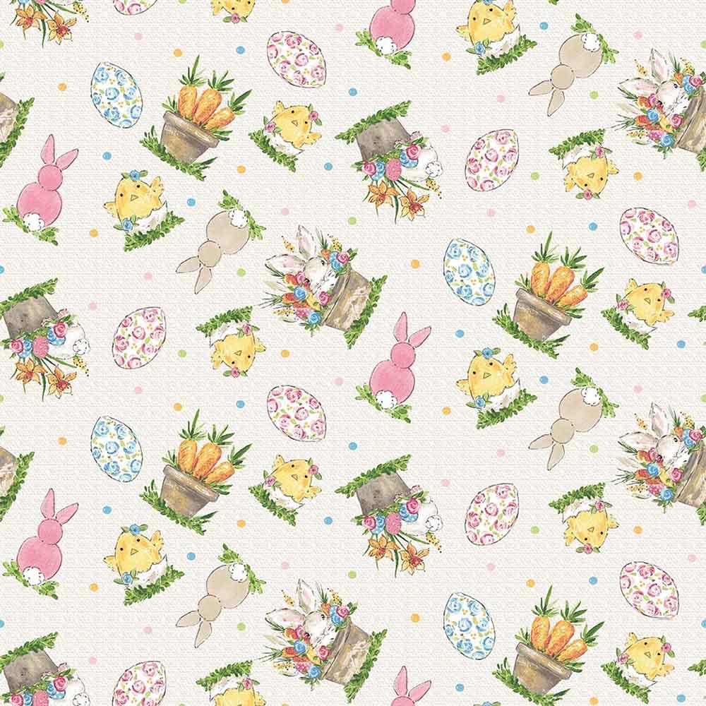 Henry Glass Fabrics - Peek A Boo Bunnies by Haley Bush - Tossed Characters & Eggs - Cream - Yardage