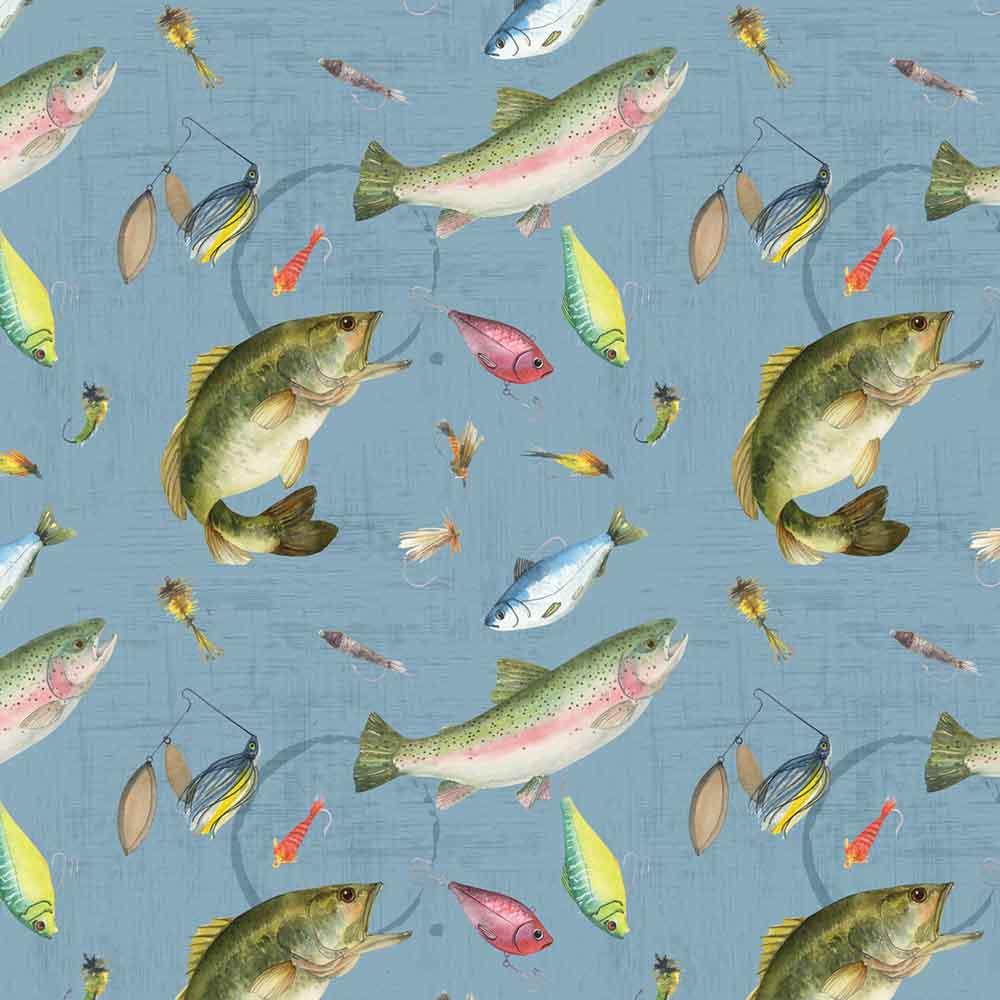Wilmington Prints - Gone Fishing by Holly Thomas Stein - Fish & Lure Toss - Blue - Yardage