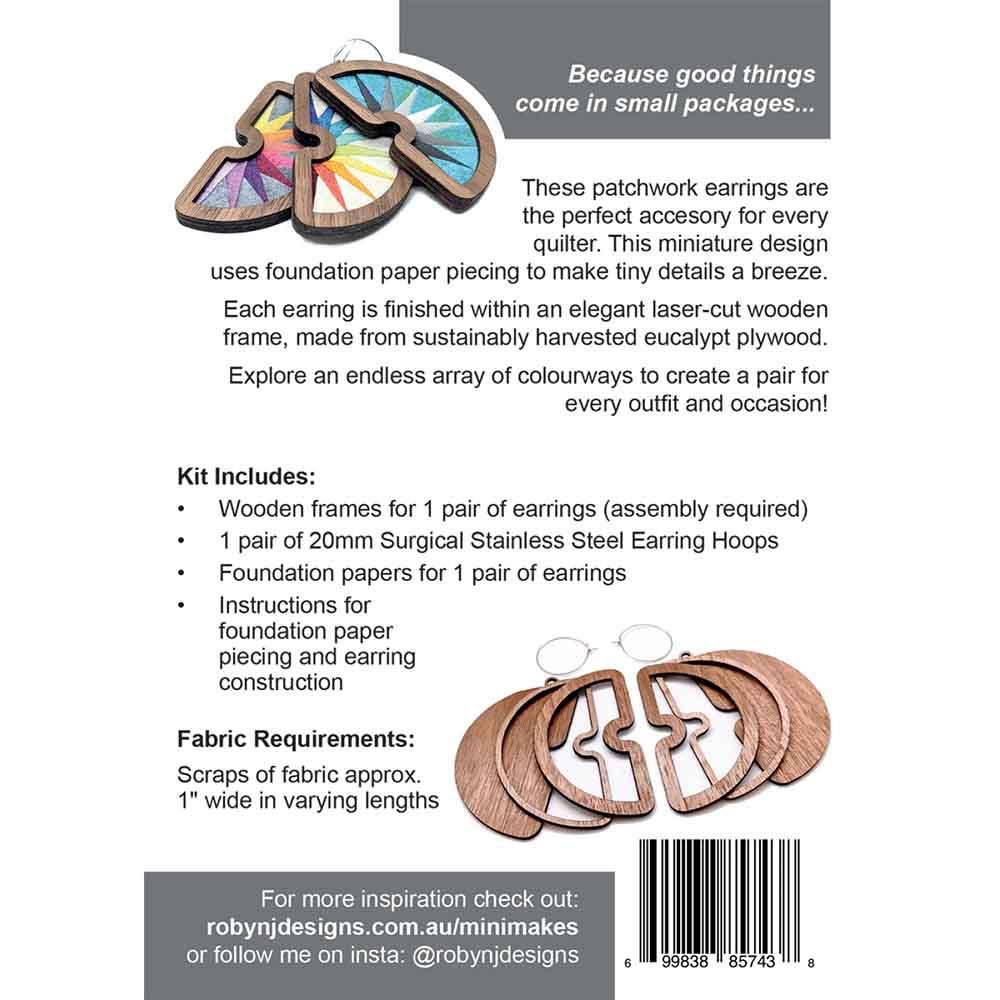 Kit Includes: Wooden frames for 1 pair of earrings (assembly required), 1 pair of 20mm Surgical Stainless Steel Earring Hoops, Foundation papers for 1 pair of earrings, Instructions for foundation paper piecing and earring construction,Â