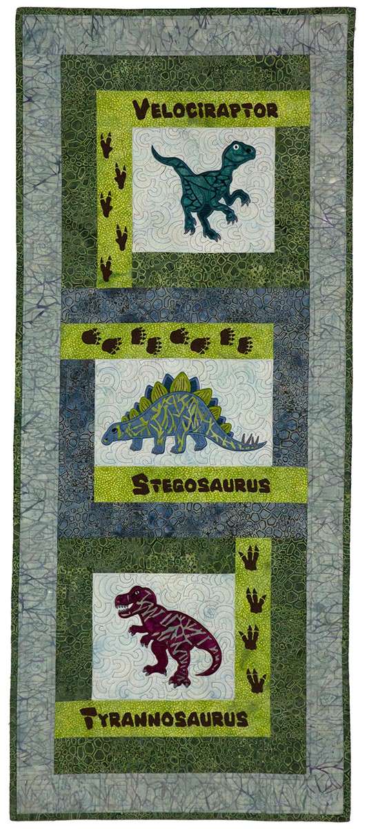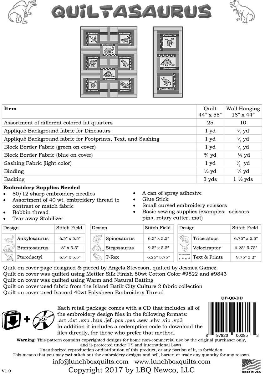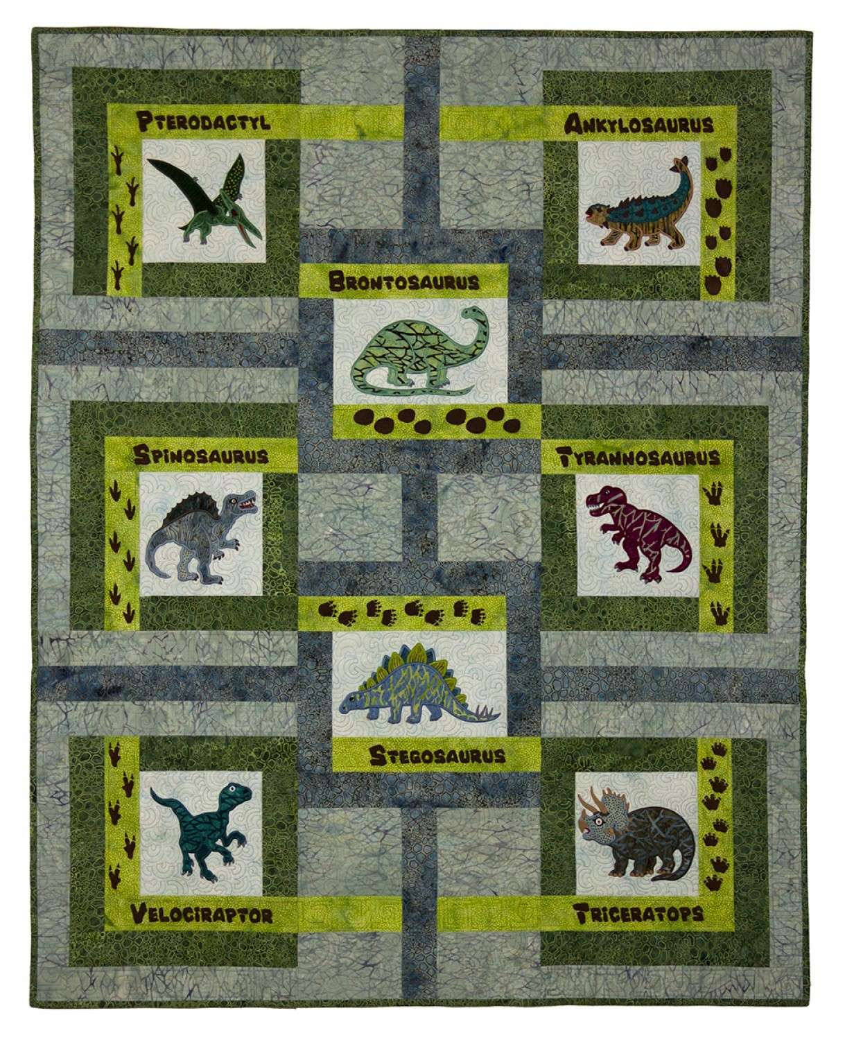 Quiltasaurus Applique Machine Embroidery Quilt Pattern with CD and Redemption Code. Eight roarsome appliqued dinosaurs stomp across this Mesozoic Era quilt. Each dinosaur has a name and foot print embroidery. Create a 44 inch x 55 inch quilt or a 16 inch x 48 inch wall-hanging. Although extinct you can bring them back to life with this fun quilt. Formats: ART, DST, EXP, HUS, JEF, PCS, PES, SEW, SHV, VIP, VP3.