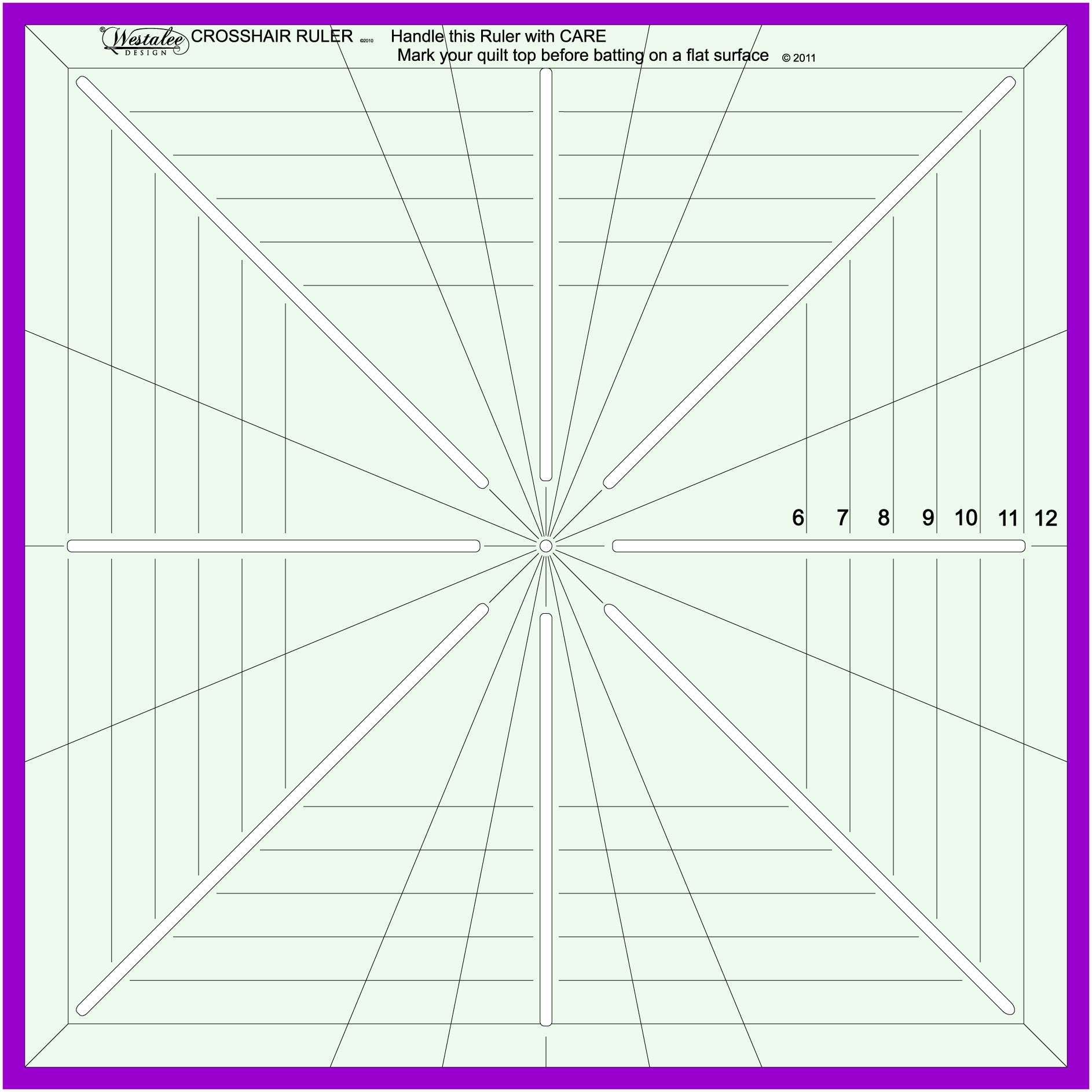12-1/2in x 12-1/2in square. Mark up to 32 reference lines on quilt Block up to 12in x 12in. Use Cross Hair Ruler to locate the centre and mark 4, 8, 16 and 32 lines, if required.