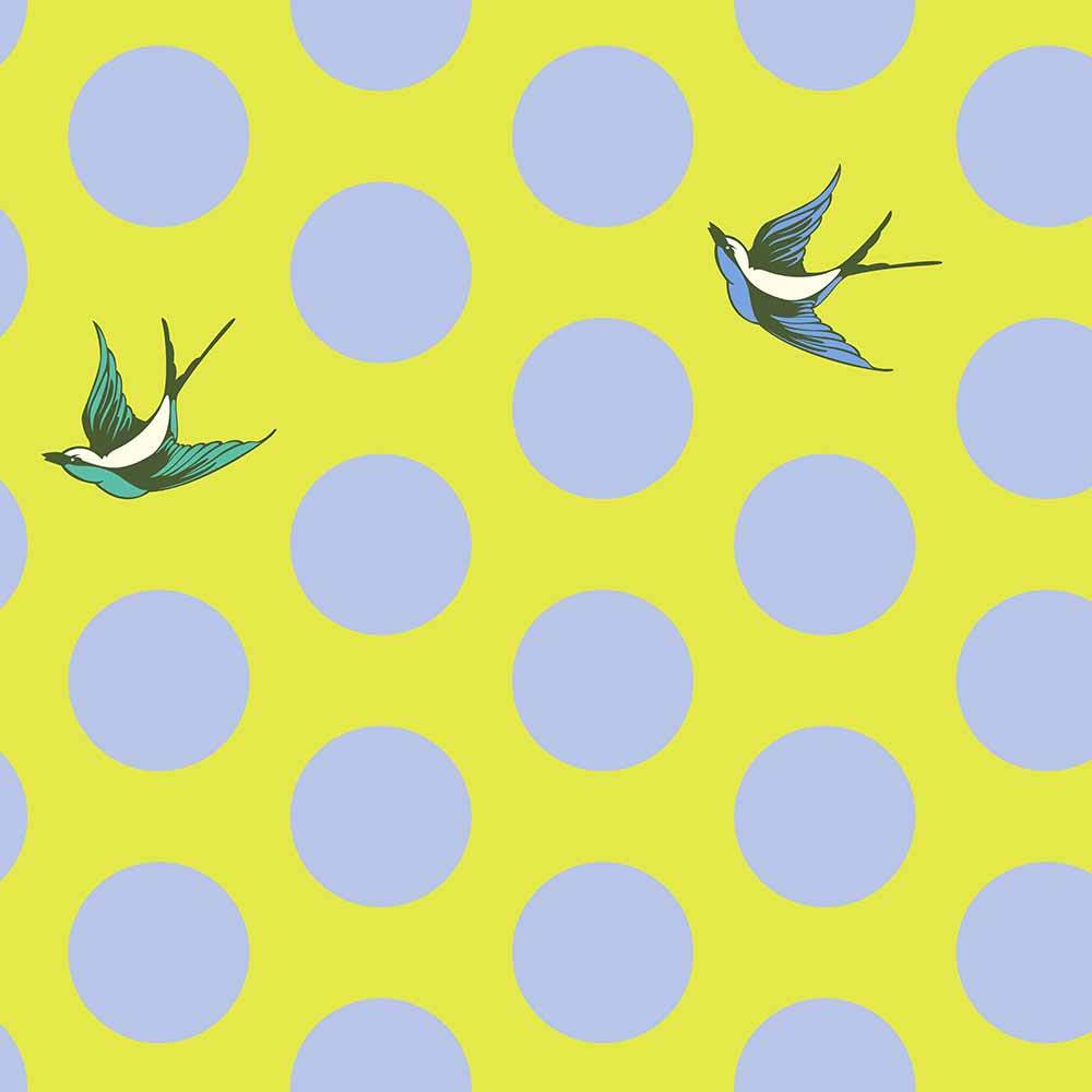 Soaring sparrows and large polka dots are featured in the FreeFall 108" wide backing in Enchanted by Tula Pink for FreeSpirit.