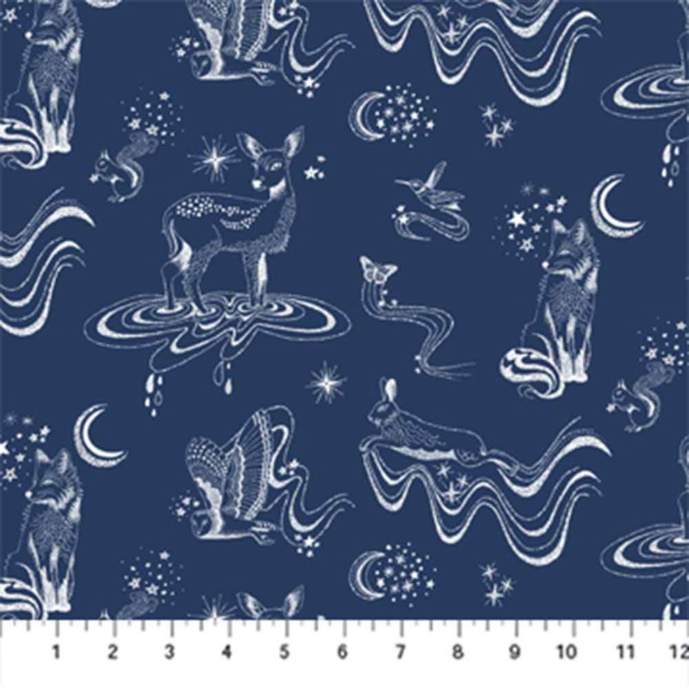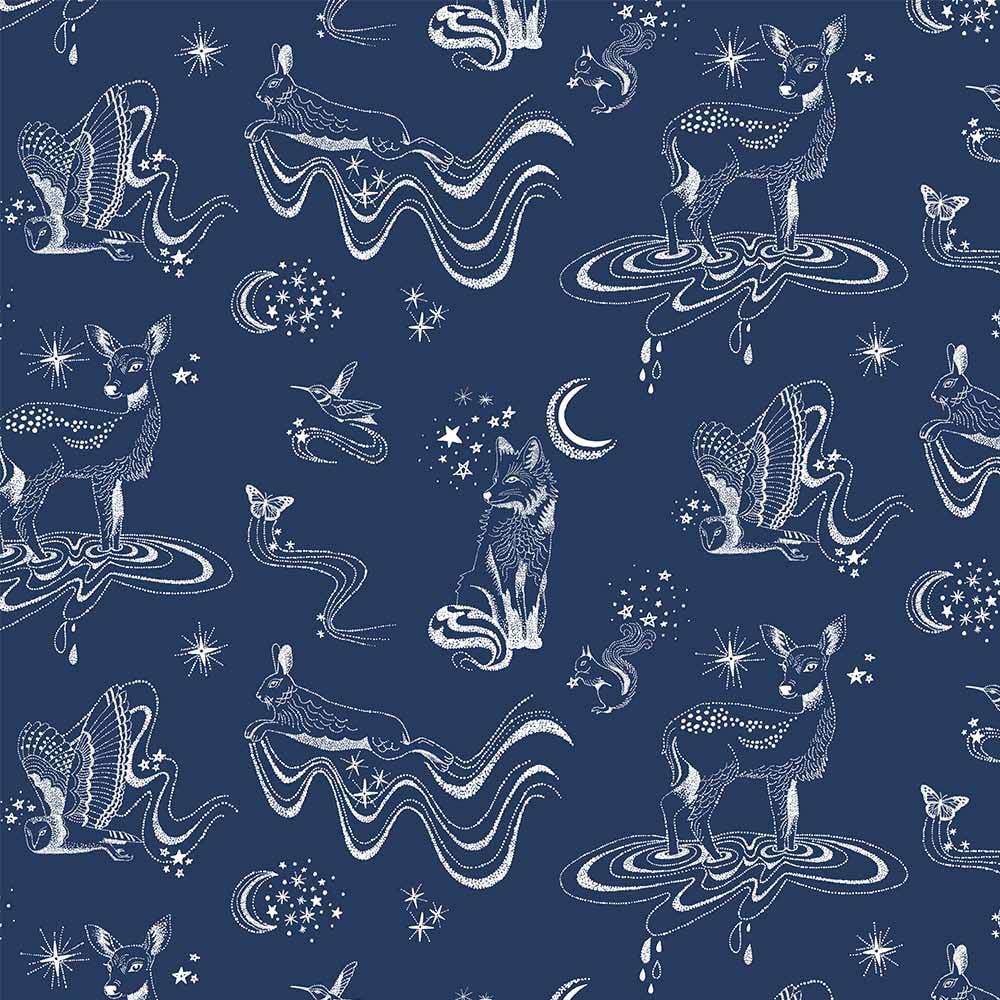 Whimsical woodland animals dance across a deep navy backdrop in Magic Garden by Josephine Kimberling. A playful, storybook print perfect for kids’ quilts, décor, and more.