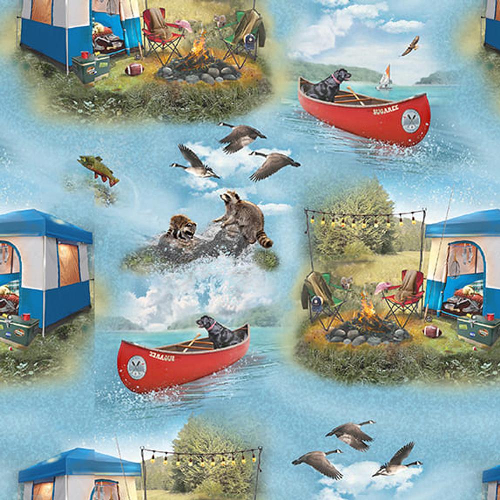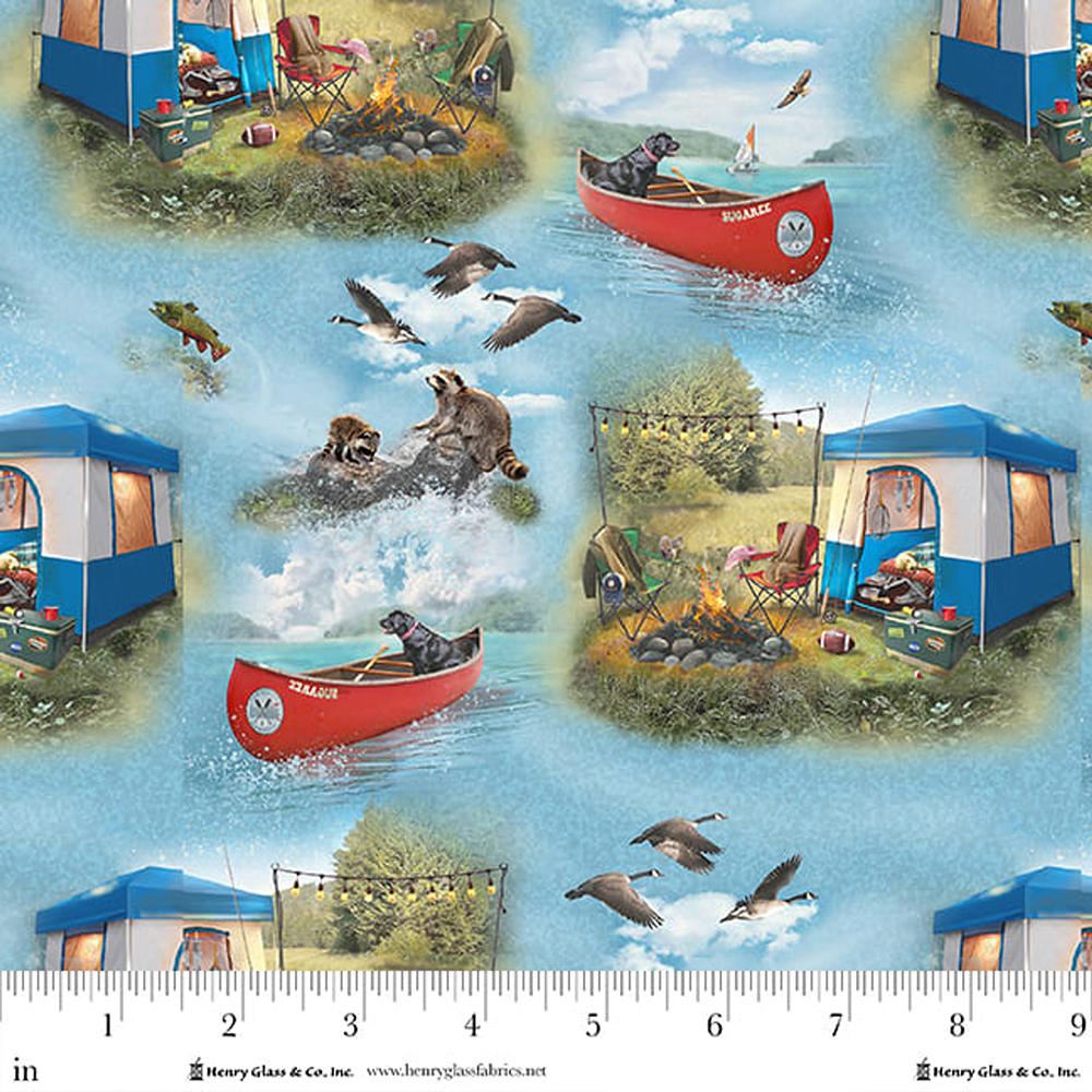 Henry Glass & Co. - Camping Pups by Robert Giordano - Pup On Canoe - Blue - Yardage