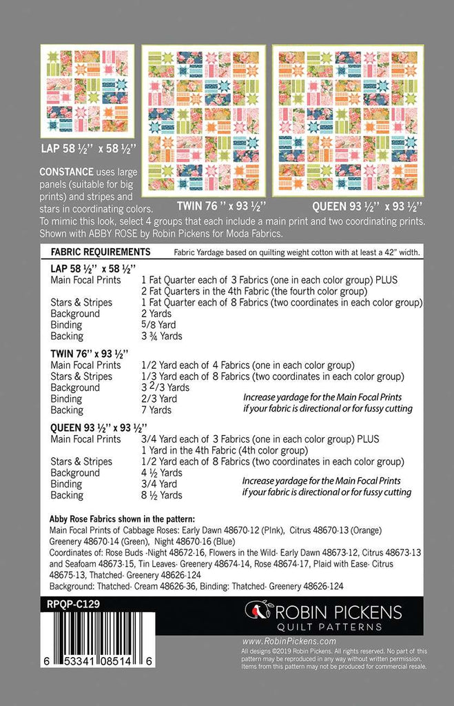 Constance uses large panels, suitable for big prints, and stripes and stars in 4 color groupings. Directions included for 3 sizes: Lap, Twin and Queen.