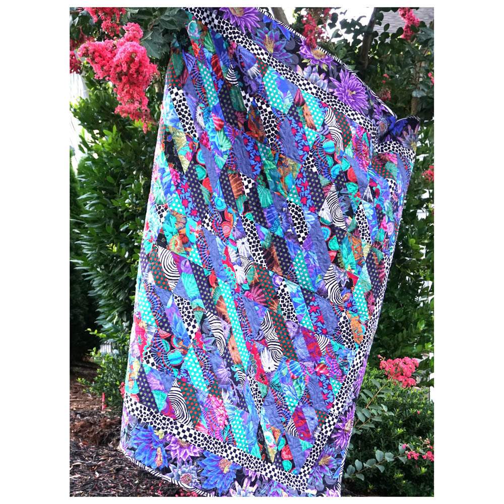 The Slide Quilt Pattern by Stacey Day has a confident beginner skill level and requires knowledge of strip piecing and bias cutting. Pattern includes paper templates.