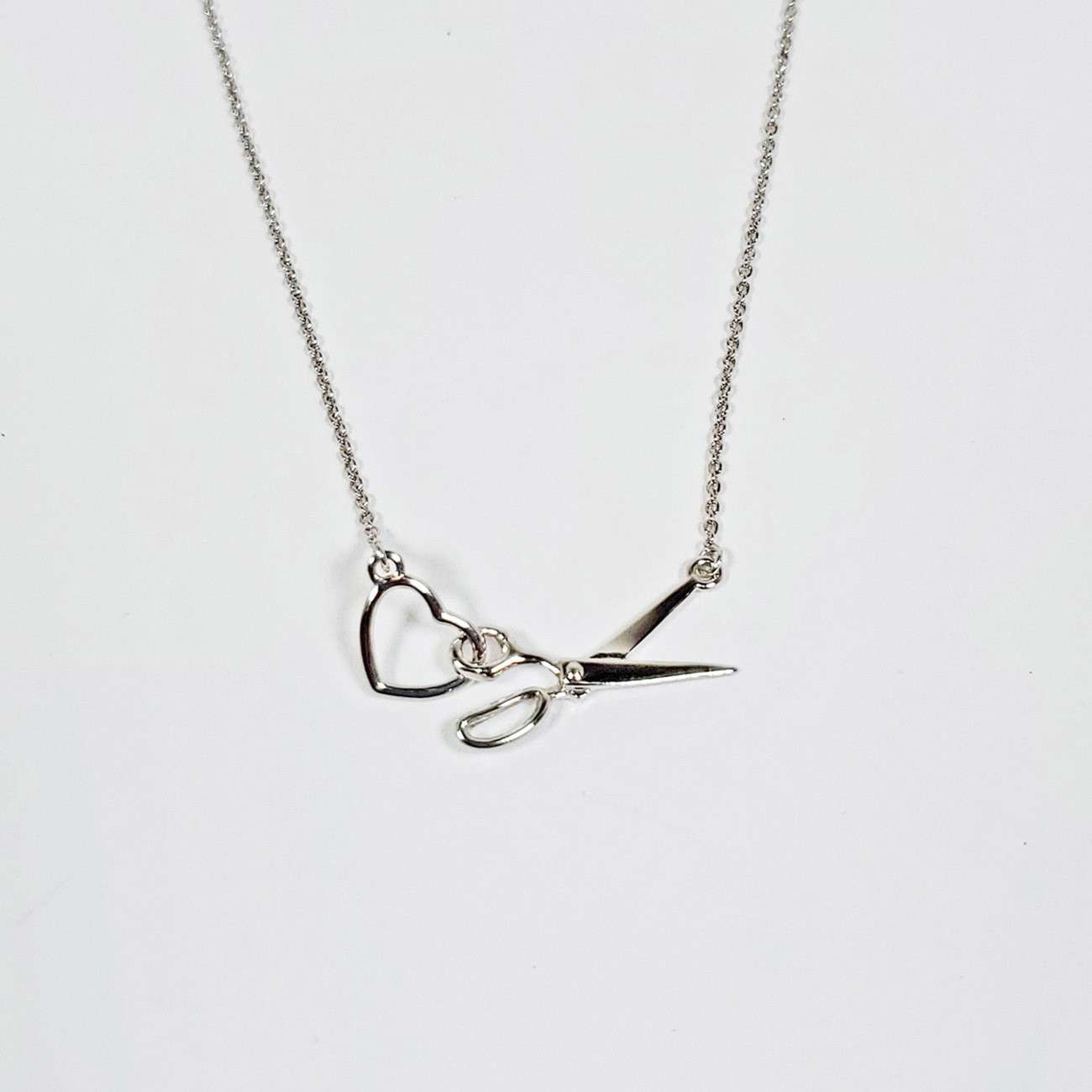 This adorable charm necklace features the scissors interlocking with the open heart charm. The Scissors measure approximately 1 1/4 in width. Necklace length is 19 plus a 2 extender chain so the total length can go up to 21. Nickel Free/Hypoallergenic.