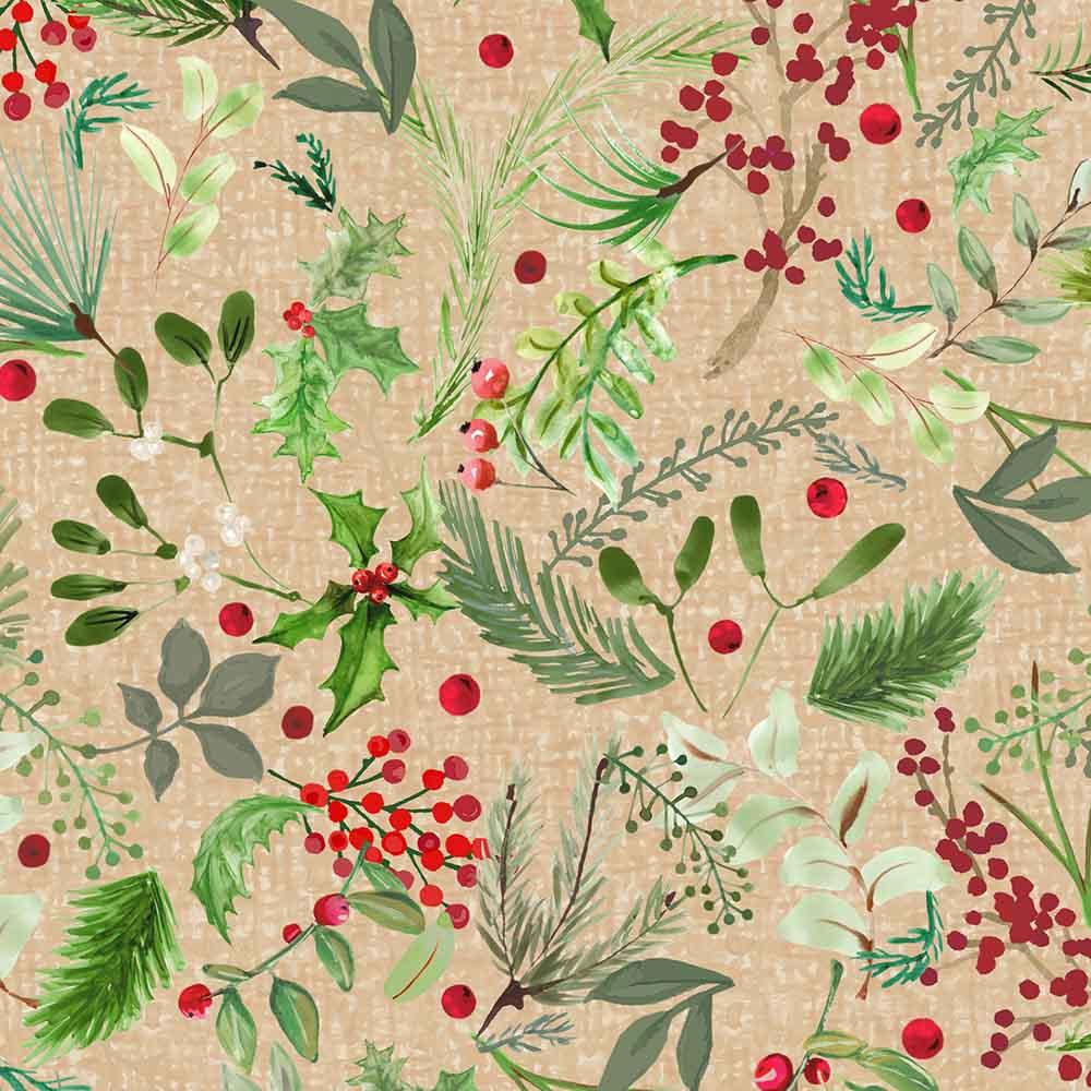 Henry Glass & Co. - Scandinavian Holiday by Mary Jane Carey - Digital - Holly Berry Sprigs - Green - Yardage