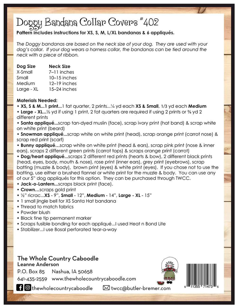 Pattern includes instructions for XS, Small, Medium, Large-XL bandanas & 6 appliques.