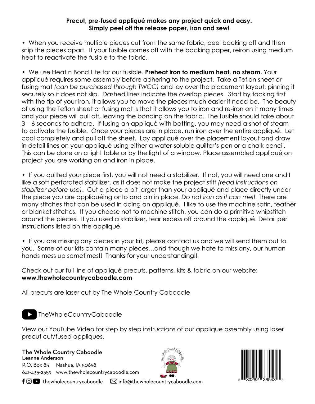 Includes precut fused applique, buttons, and finished drawing for assembling applique