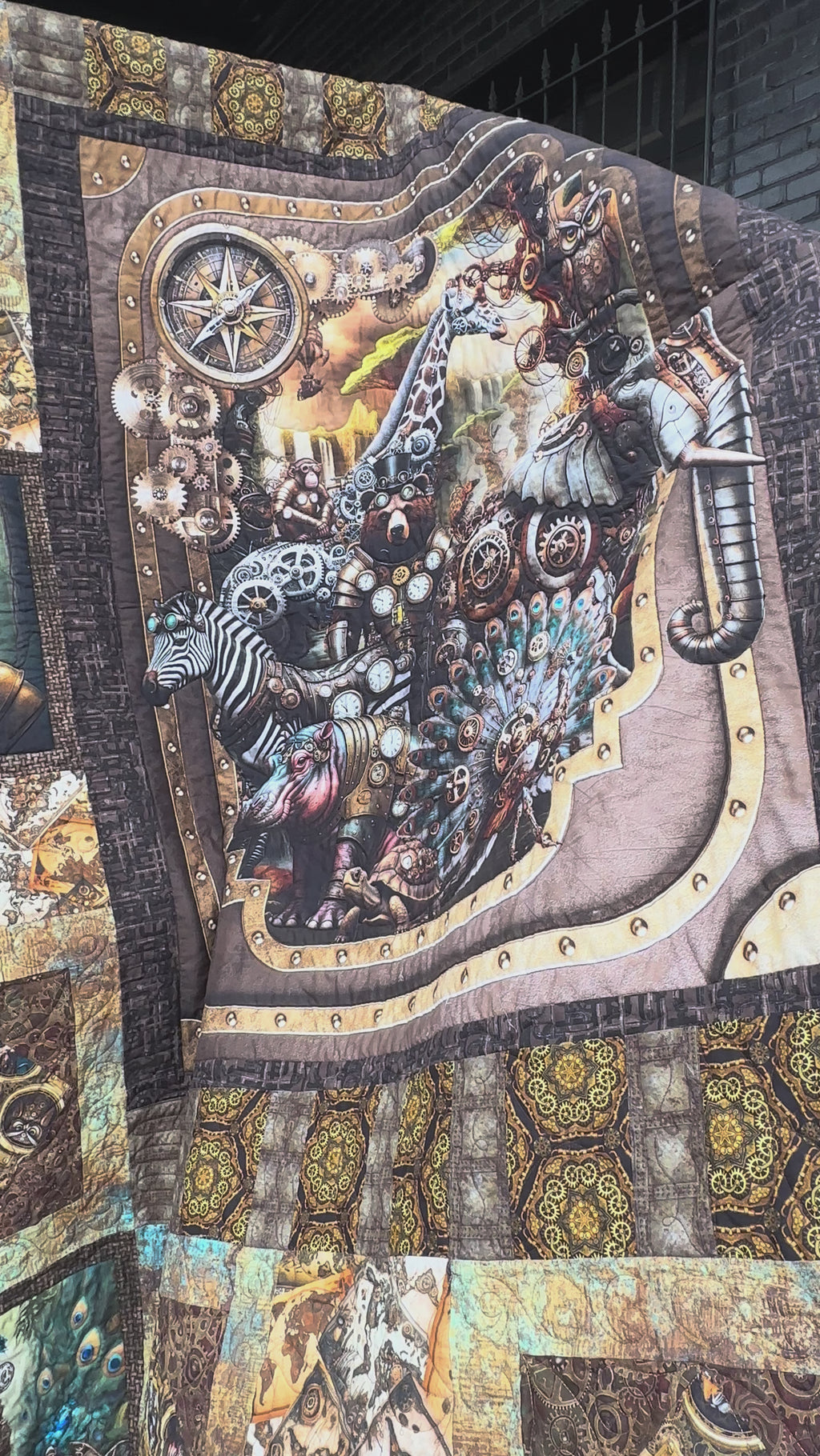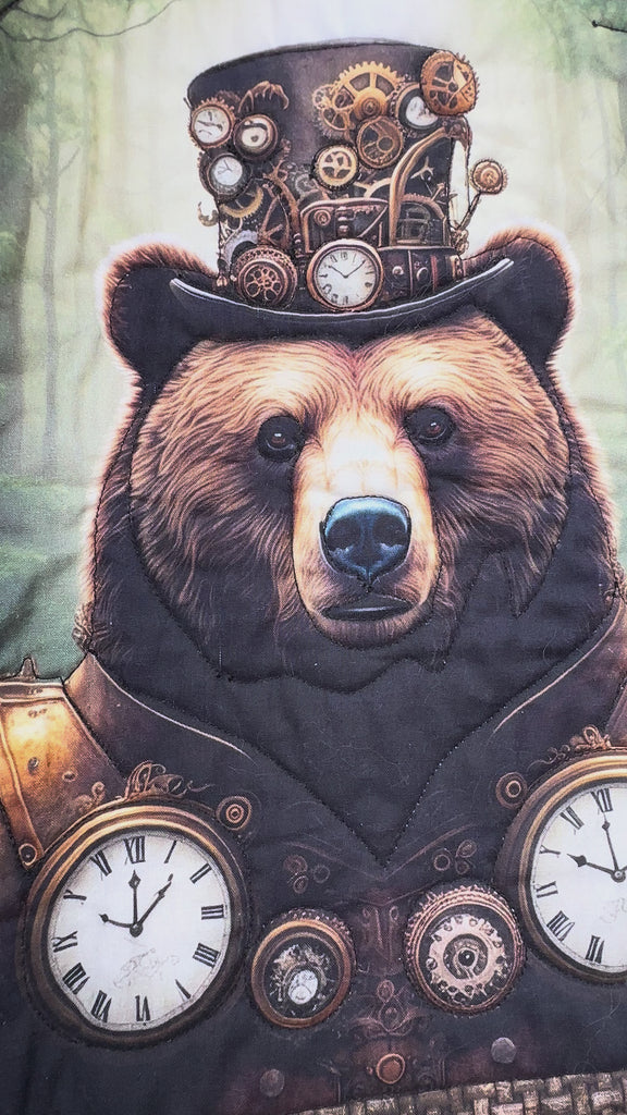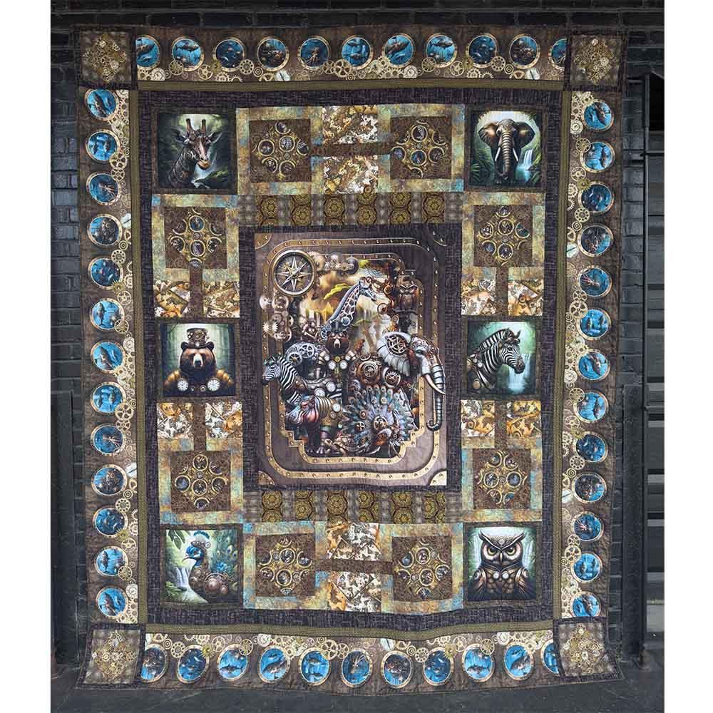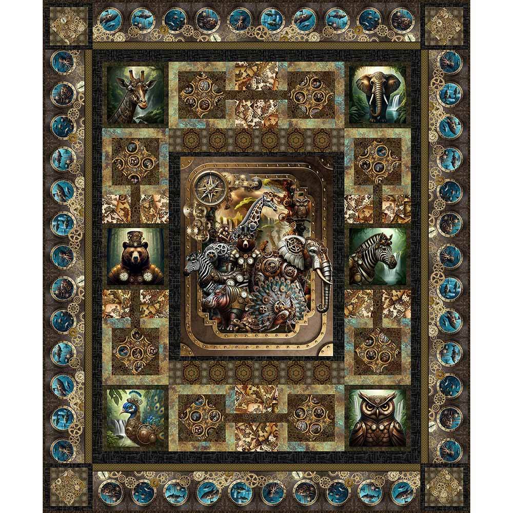 The Steampunk Menagerie Kit includes pattern by In the Beginning and all the fabrics needed, including panels, for the top and binding of a 89" x 107" quilt. Backing available separately, 9 yards x 44" or 3-1/2 yards x 108" wide recommended.