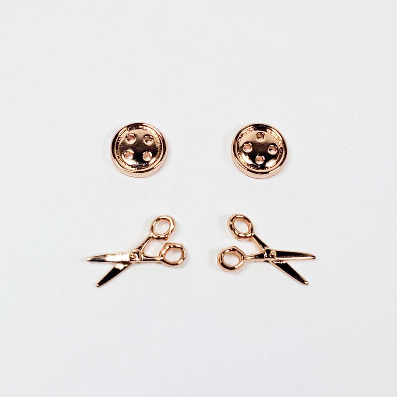 Set of 2 post earrings featuring one set of buttons and one set of scissors. Wear one set on one day and change for another day or mix and match your style. Individual earrings are approximately 1/2 x 1 /2 in size. Nickel Free/Hypoallergenic.