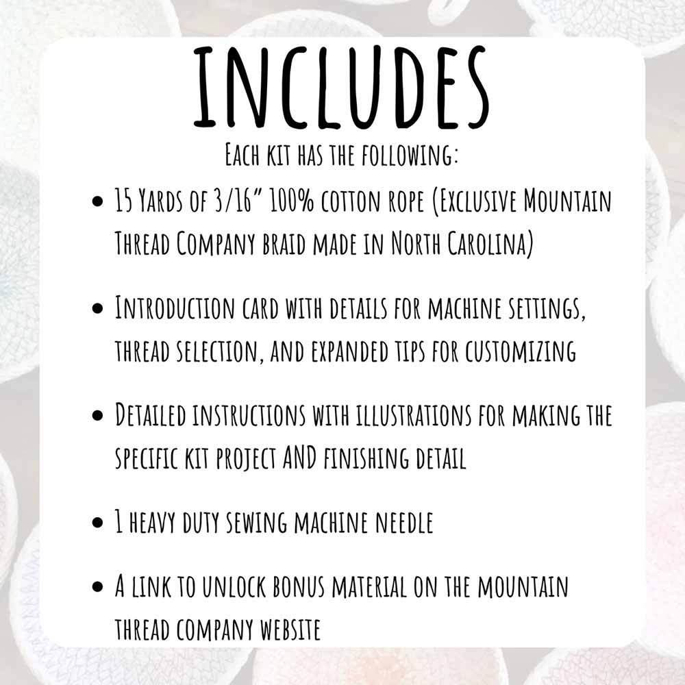 The Set of Five Trinket Bowls DIY Rope Basket Kit from The Mountain Thread Company sets you up to sew FIVE adorable tiny trinket bowls to customize as you wish. The finished baskets would be the perfect size to hold change, coins, or small jewelry. Expect some variation, but each basket would measure around 3” across and about 1” tall. Make it even more unique by using up fabric scraps from old projects! This is a sewing machine project. Your sewing machine will need a zigzag stitch and be able to handle sewing something like jeans. 50wt high quality thread is also highly recommended. This is an introductory basket project for sewists who are confident in steps like changing the machine needle, adjusting stitch length and width, and pivoting. This is a Do It Yourself Kit—no finished products are included.