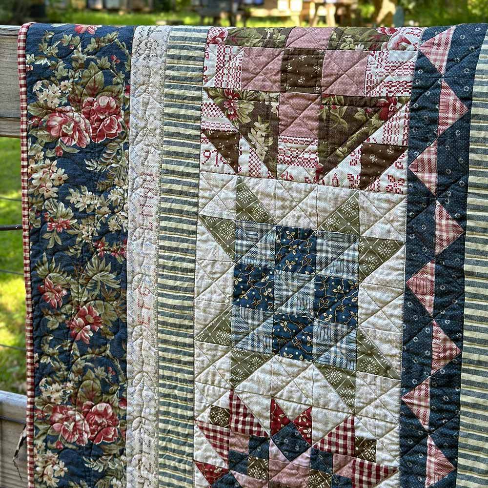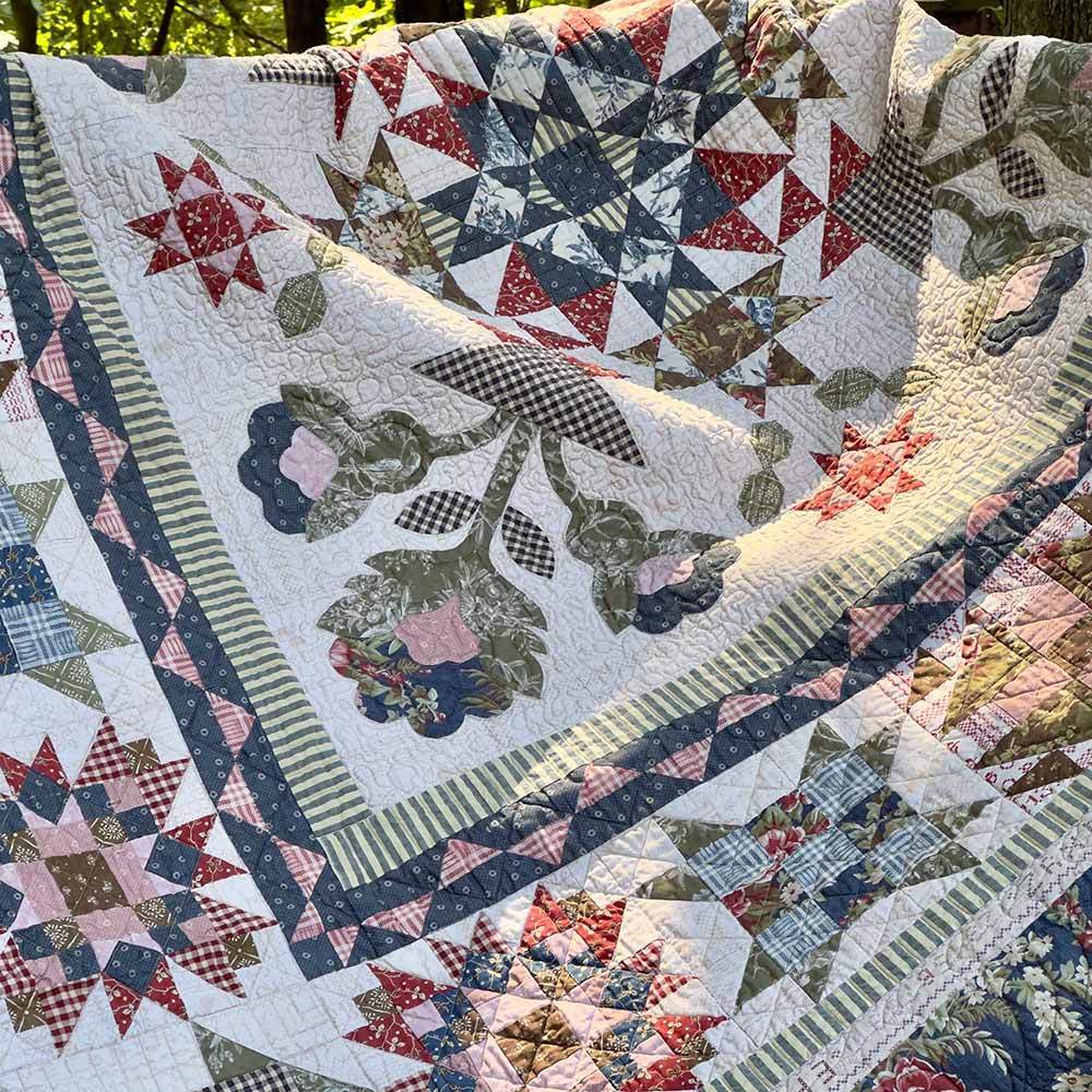 Bring together a fractured star and baskets of appliqued flowers for a focal point in this medallion style quilt. The fabrics featured are from the Haberdashery collection by Dawn Heese and skillfully combine sweet geometrics, lovely florals and rustic wovens.