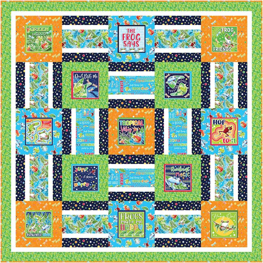 These rainforest frogs are so happy and colorful, they seem to just jump off the fabric! The two panels both feature adorable froggy sayings, and we’ve added a great border stripe and tons of amphibian coordinates too. The colors are vibrant, all the hues of orange and blue and green just pop and hop. To make them even better, we’ve made the entire collection glow in the dark! The Hoppy Days Quilt Kit includes pattern by Stephanie Sheridan and all the fabrics needed to complete the quilt top and binding. Finished size is 56" x 56". Backing available separately, 4 yards x 44" wide recommended.