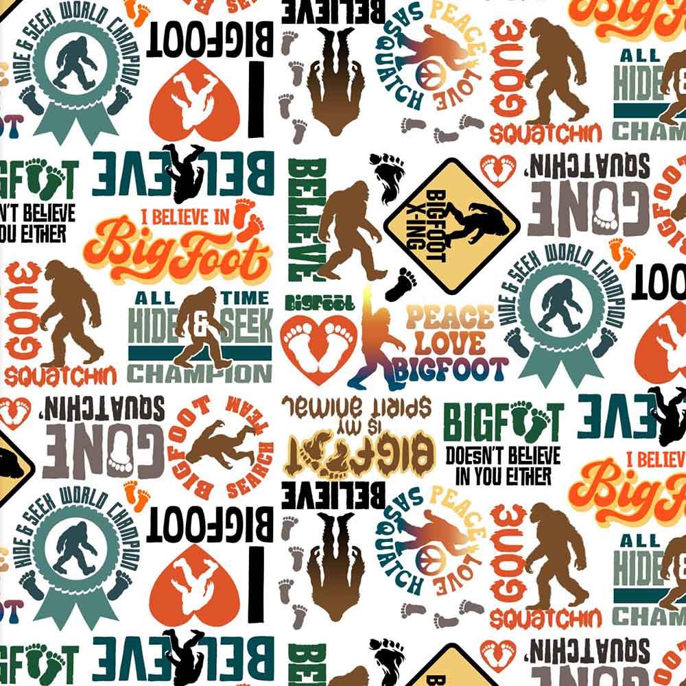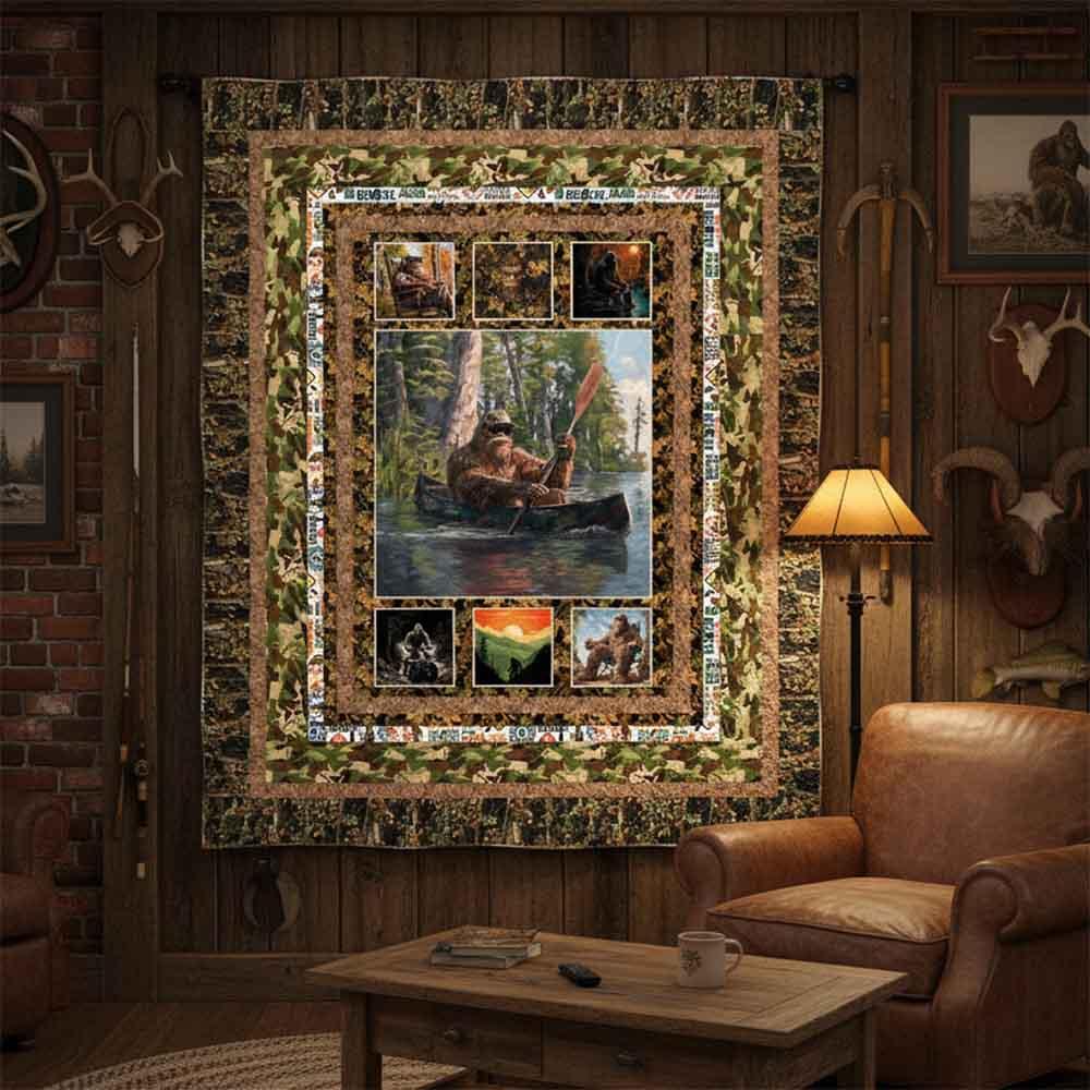 A quiet canoe ride is one of Bigfoot's favorite things. The Legendary Loner Kit includes pattern from 3 Wishes and all the fabrics needed, including panel, for the top and binding from the Legendary Loner collection by Jim Baldwin. Finished size is 49" x 61". Backing is available separately, 3 yards x 44" wide recommended.