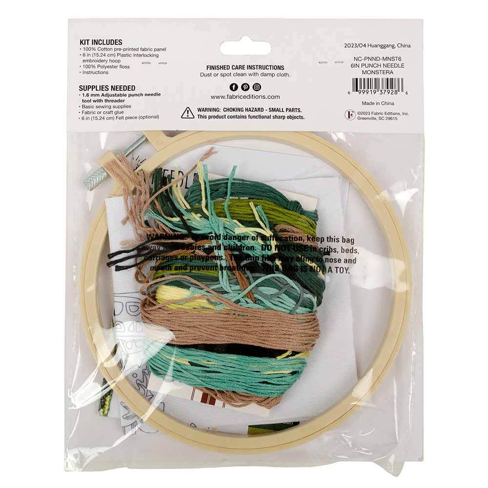 Kit includes 100% Polyester Pre-Printed Panel, embroidery Floss, may include miscellaneous embellishments, 6" plastic locking embroidery hoop and easy to follow instructions. Kit requires a basic knowledge of punch needle. Needle punch tool sold separately. Additional supplies that may be needed are listed on instructions.