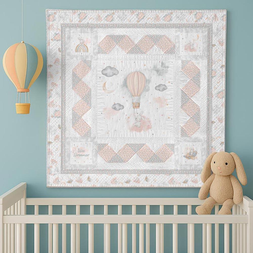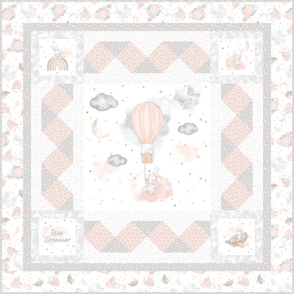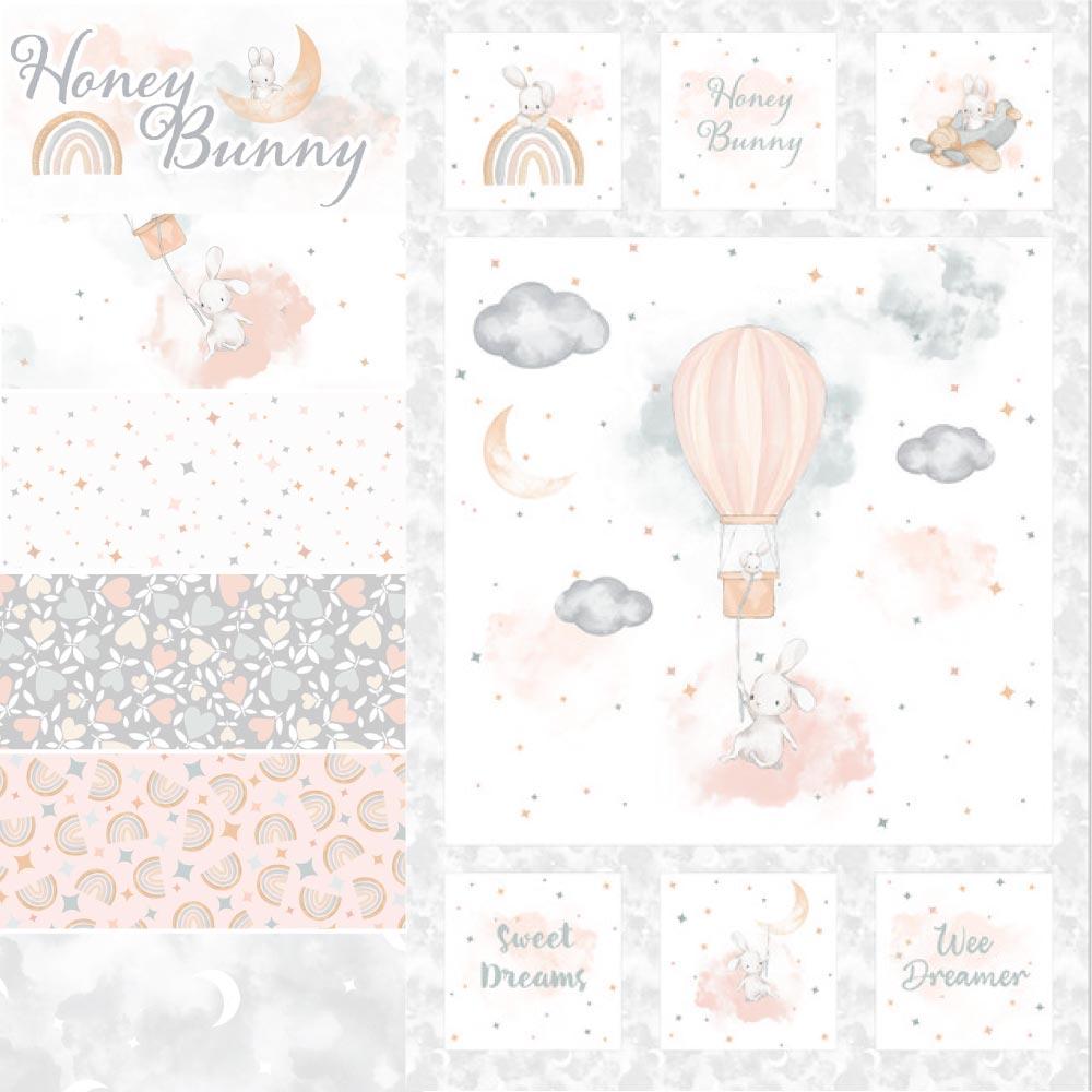 Bring warmth and whimsy to your little one's room with this new project by Bound to be Quilting featuring the Honey Bunny collection by Maywood Studio. Prints include rainbows, hot air balloons, floppy-eared bunnies, fluffy clouds, hearts, and stars that evoke a sense of adventure and comfort. The Moving Along 2 Kit includes pattern and all the fabrics needed, including panel, for the top and binding. Finished size of this confident beginner project is 55" x 55". Backing available separately, 3-1/2 yards x 44" wide is recommended. Suggested backings are the Honey Bunny, Hearts print in Light Grey, or the Honey Bunny, Bunny in the Clouds Minky fabric.