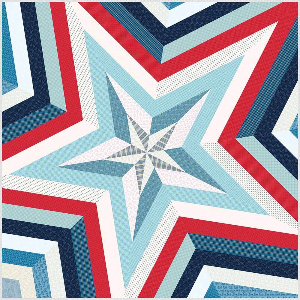 This project truly radiates! Star Storm features the Primitive Cloth collection by Sew Kind of Wonderful, which features this moody assortment of blues, creams, grays, and one stunning red feature fabric that's inspired by the timeless symbols of patriotism, perfect for honoring national pride in every stitch. With classic elements of stars, stripes, anchors, flowers, and even a horse and buggy, this collection evokes love for the country. Kit includes pattern designed by Victoria Findlay Wolfe that includes large-scale re-useable paper pattern templates for precise piecing and all the fabrics needed for the top and binding. Finished size is 80" x 80". Backing is available separately, 5 yards x 44" wide is recommended.