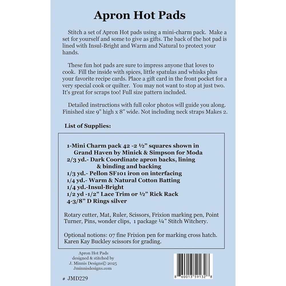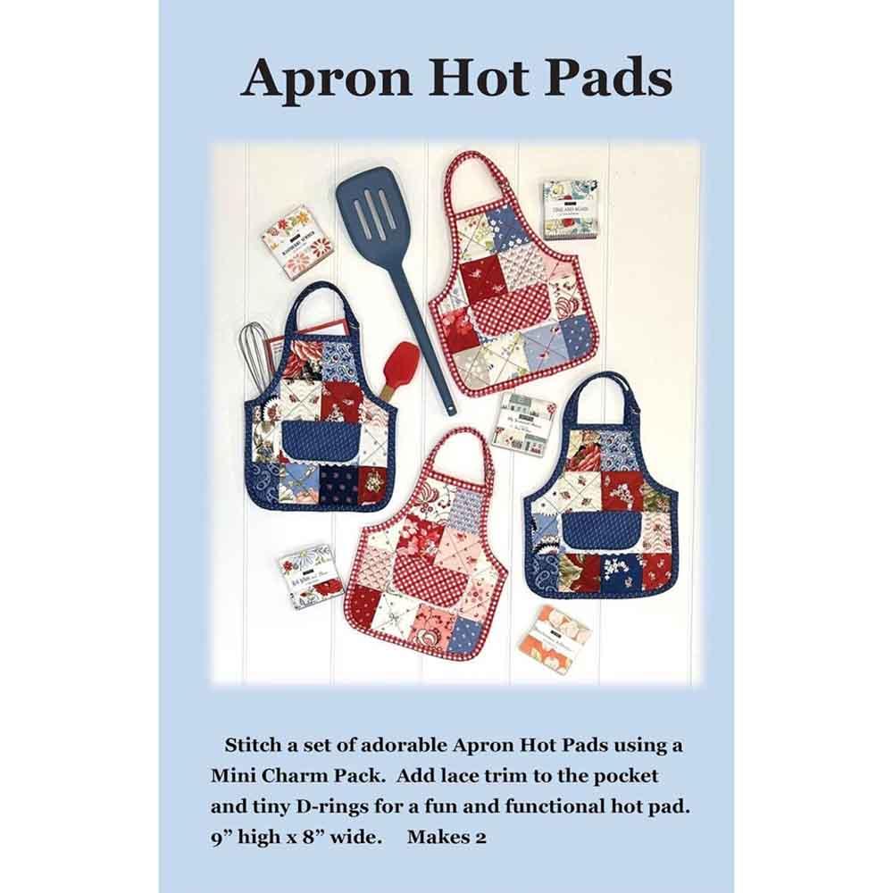 This is such a lovely hot pad pattern! Your kitchen will love it! In fact, this pattern was featured in Quilting Digest. Stitch a set of Apron Hot pads using a mini-charm pack. Make a set for yourself and some to give as gifts. The back of the hot pad is lined with Insul-Bright and Warm and Natural to protect your hands. These fun hot pads are sure to impress anyone that loves to cook. Fill the inside with spices, little spatulas and whisks plus your favorite recipe cards. Place a gift card in the front pocket for a very special cook or quilter. You may not want to stop at just two. It's great for scraps too! Full size pattern included. Fabric shown in the sample hot pads is Moda Fabrics Moda Mini-Charms.