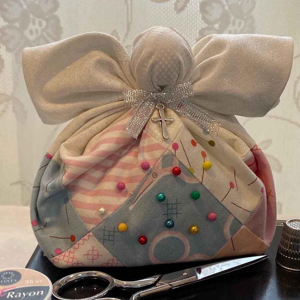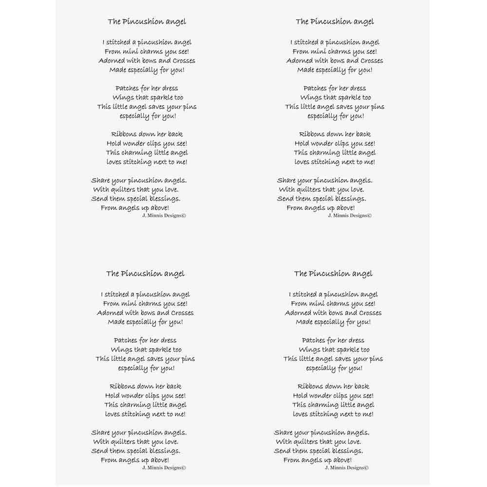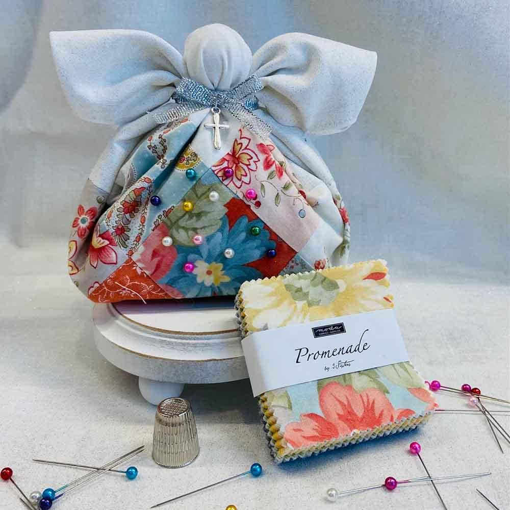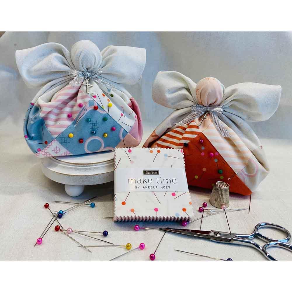Stitch an angelic set of pincushions using a mini charm pack and sparkling fabric for their wings and lining. Keep one for yourself and give one as a gift. Ribbons trailing down her back hold wonder clips. The unique mini charm pack you choose will compliment any decor. A separate lining bag holds walnut shells.