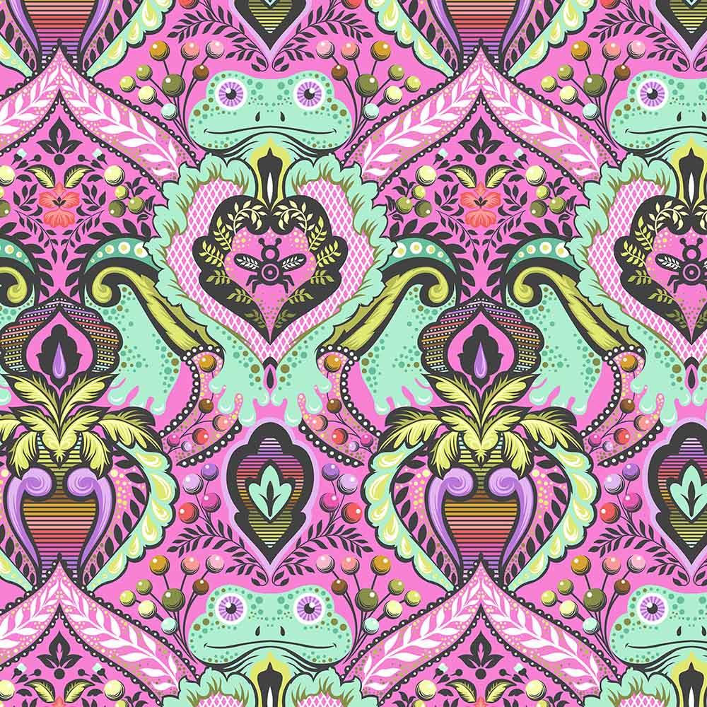 The beloved designer Tula Pink for FreeSpirit Fabrics, created the Déjà Vu collections to give both longtime fans and new collectors a chance to enjoy her past designs, without collector-level pricing. For this release, she reimagines Prince Charming in a bold new colorway, turning up the volume with vibrant, expanded rainbow of colors. Designed to shine on its own or pair beautifully with True Colors, this eight-piece mini collection is a fresh and joyful take on a beloved favorite. Featured form the Prince Charming Déjà Vu collection is "Frog Prince" in the colorway "Gumball".