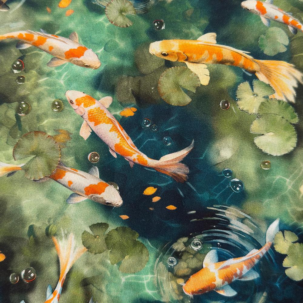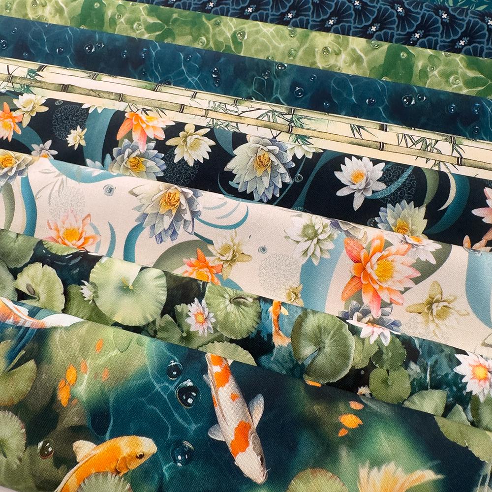 The Koi Pond collection by Clint Eagar for P&B Textiles showcases serene, nature-inspired artwork with koi, lily pads, and water-inspired prints in rich greens, blues, teals, and coordinating tones. These 100% cotton quilting fabrics combine artistic scale and beautiful coordination—perfect for quilts, accents, and creative projects inspired by tranquil garden ponds. This fat quarter bundle includes 12 pieces cut at 18" x 21".