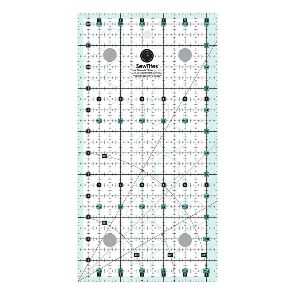 This Sew Magnetic ruler is an 6-1/2in x 12-1/2in acrylic ruler with a turquoise and black imprint. The 1/2om numbers are in turquoise boxes, and the 1in numbers are in black boxes.