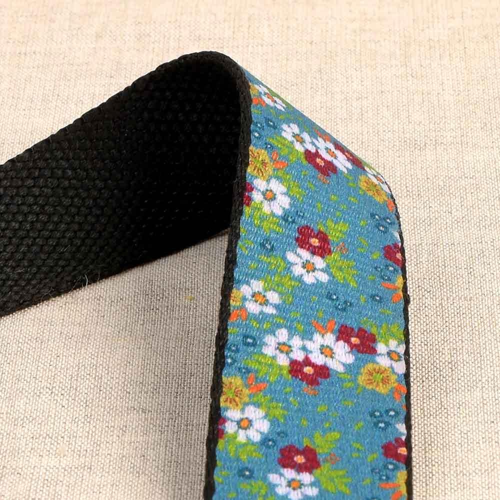 Unique floral design webbing. 30mm (1-3/16") by 22 yards. 100% Polyester. Single side design white, red, & yellow flowers with green leaves on blue background. Sold black on reverse side. Great for straps and belts.
