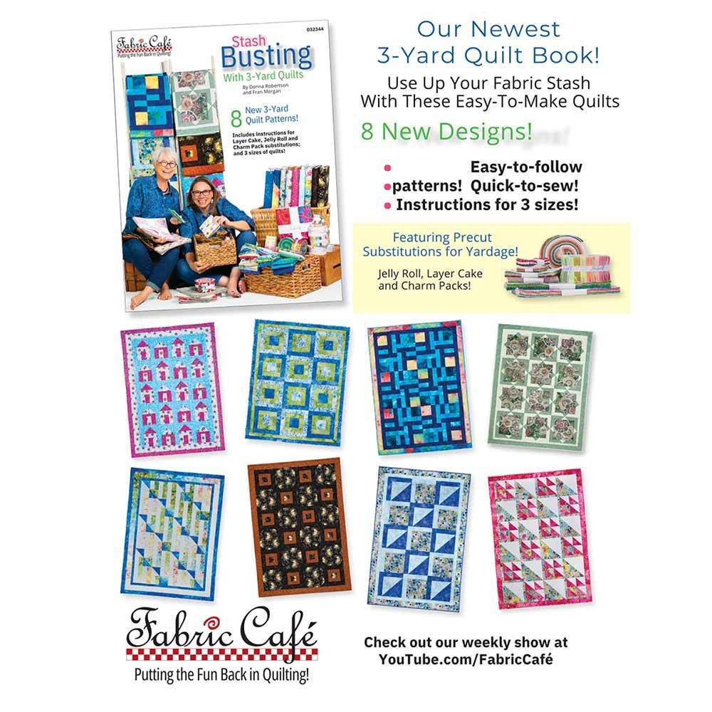 Donna Robertson and Fran Morgan co-founders of Fabric Café, known for their signature 3-yard quilt method, announce a new pattern book, Stash Busting With 3-Yard Quilts! You now have a choice, use yardage, Layer Cakes, Jelly Rolls, and Charm Packs! Instructions for lap, twin, and queen/king are included. This means no more complicated math when a larger size quilt is desired and more time to quilt!