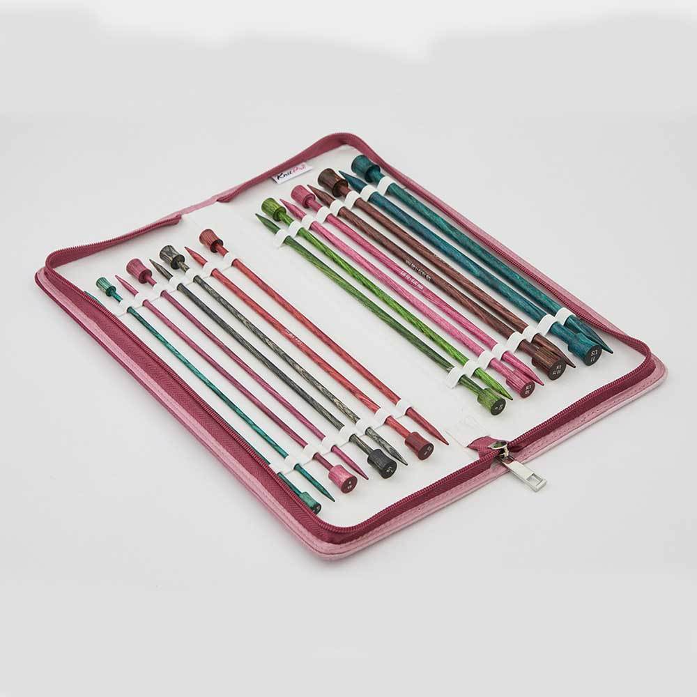 The color-coded knitting needles are packed in a beautiful zippered Bordeaux fabric case.