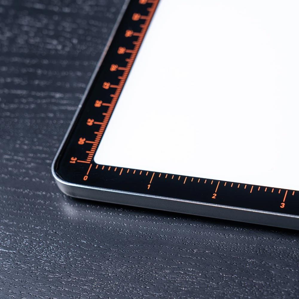 3-step illumination levels to suit your paper weight and fabric thickness, with ruled edge measurement scale in cm and inches for visual accuracy.