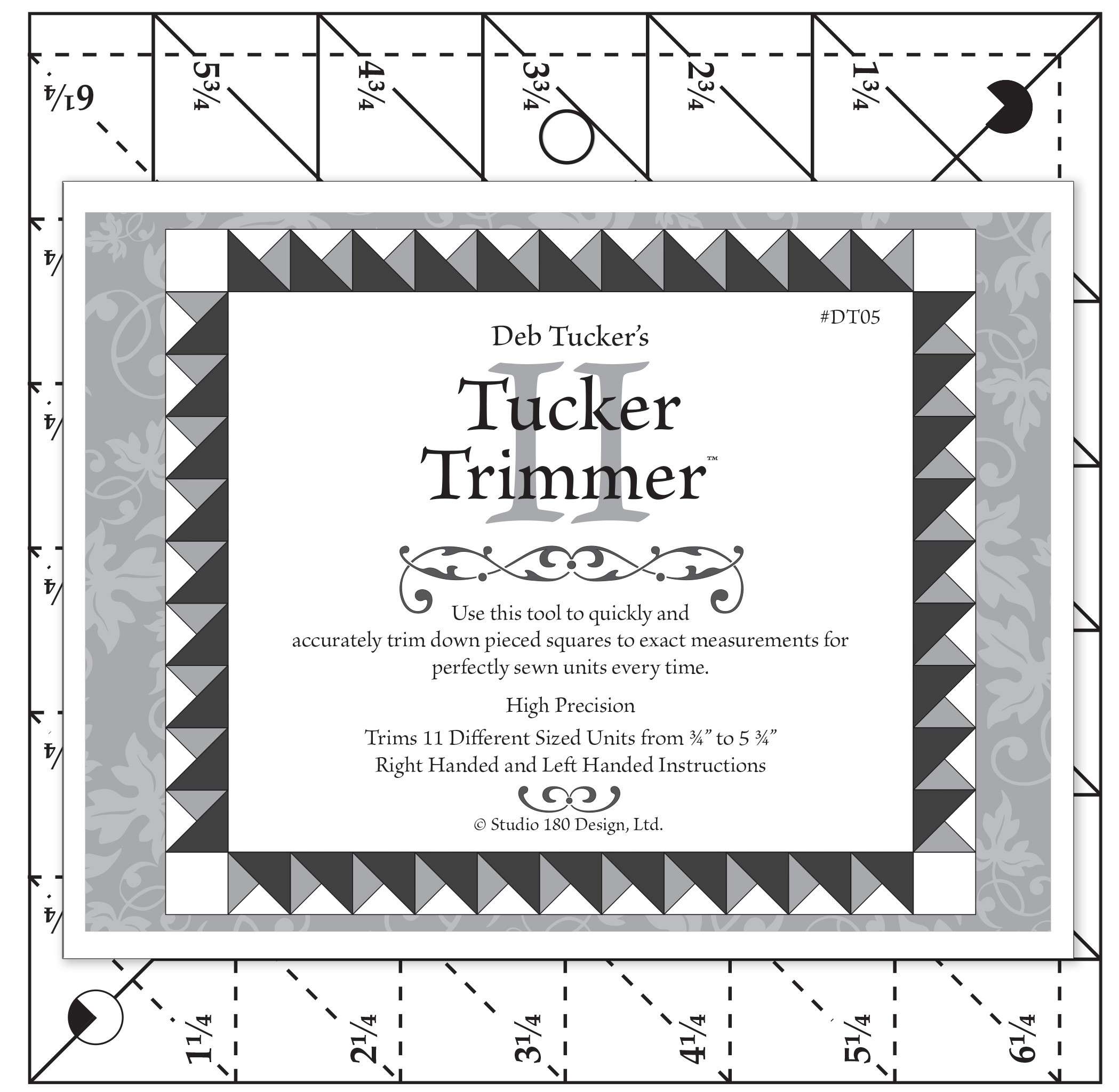 Use this acrylic template to trim down half-square and quarter-square triangles and combinations of the two. It makes 10 units from 3/4" to 5-3/4" (finished size) in 1/4" and 3/4" increments. From Deb Tucker’s Studio 180 Design. 6 1/2" x 6 1/2".